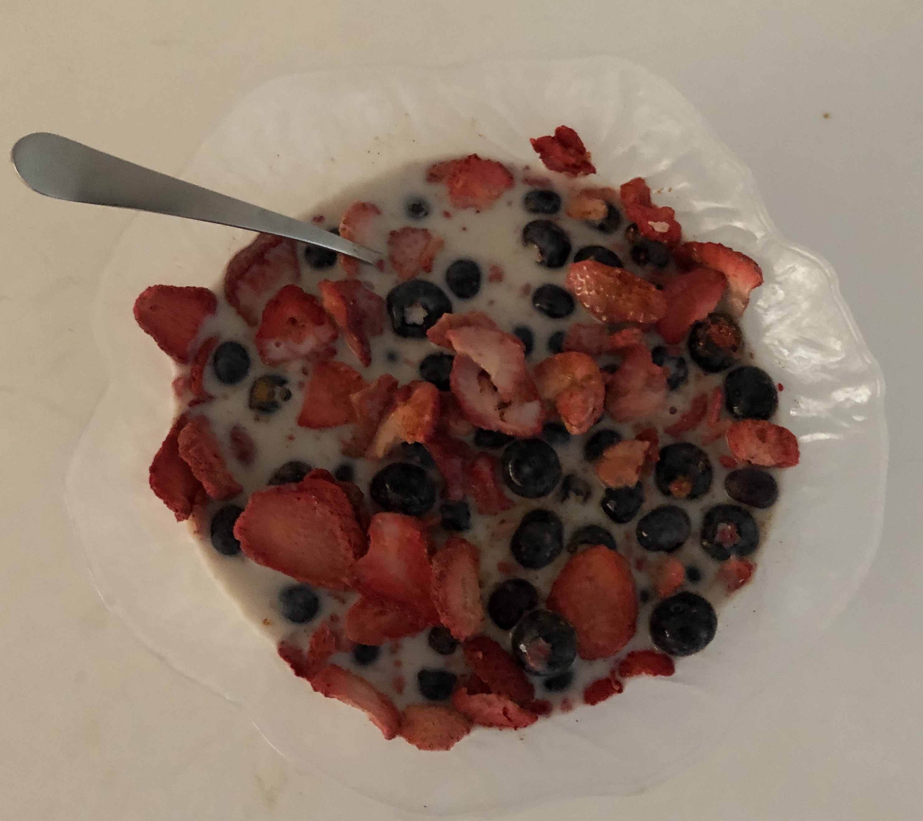 Organic blueberries, dehyrdrated strawberries, almond milk, cinnamon & cayenne pepper. Just an excuse to eat dehydrated strawberries. Gosh, I love those. View attachment 822147