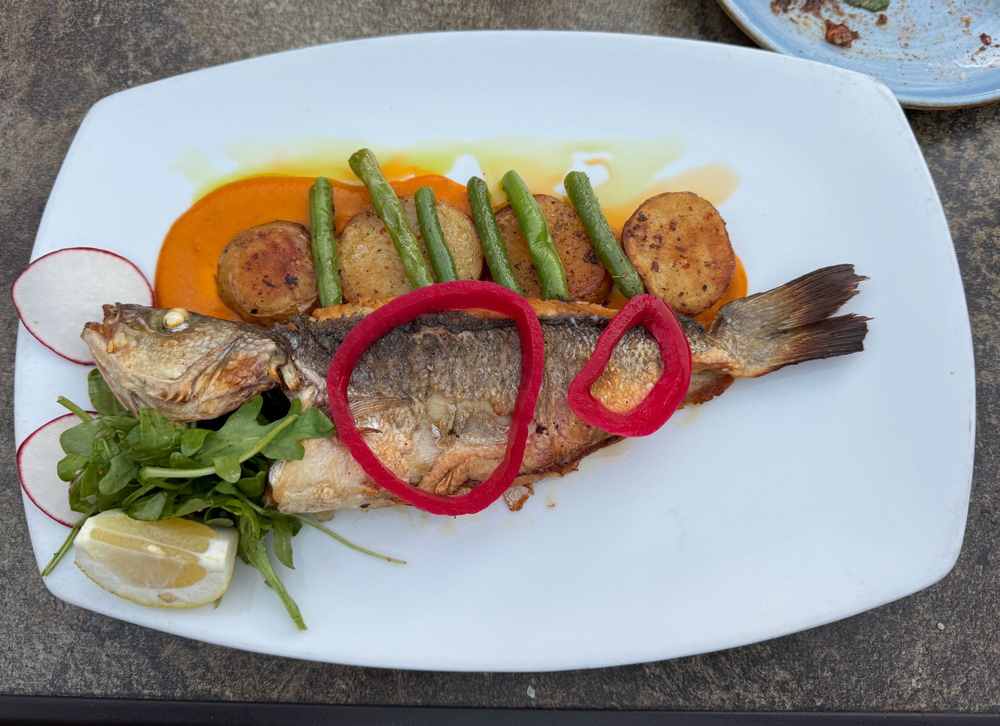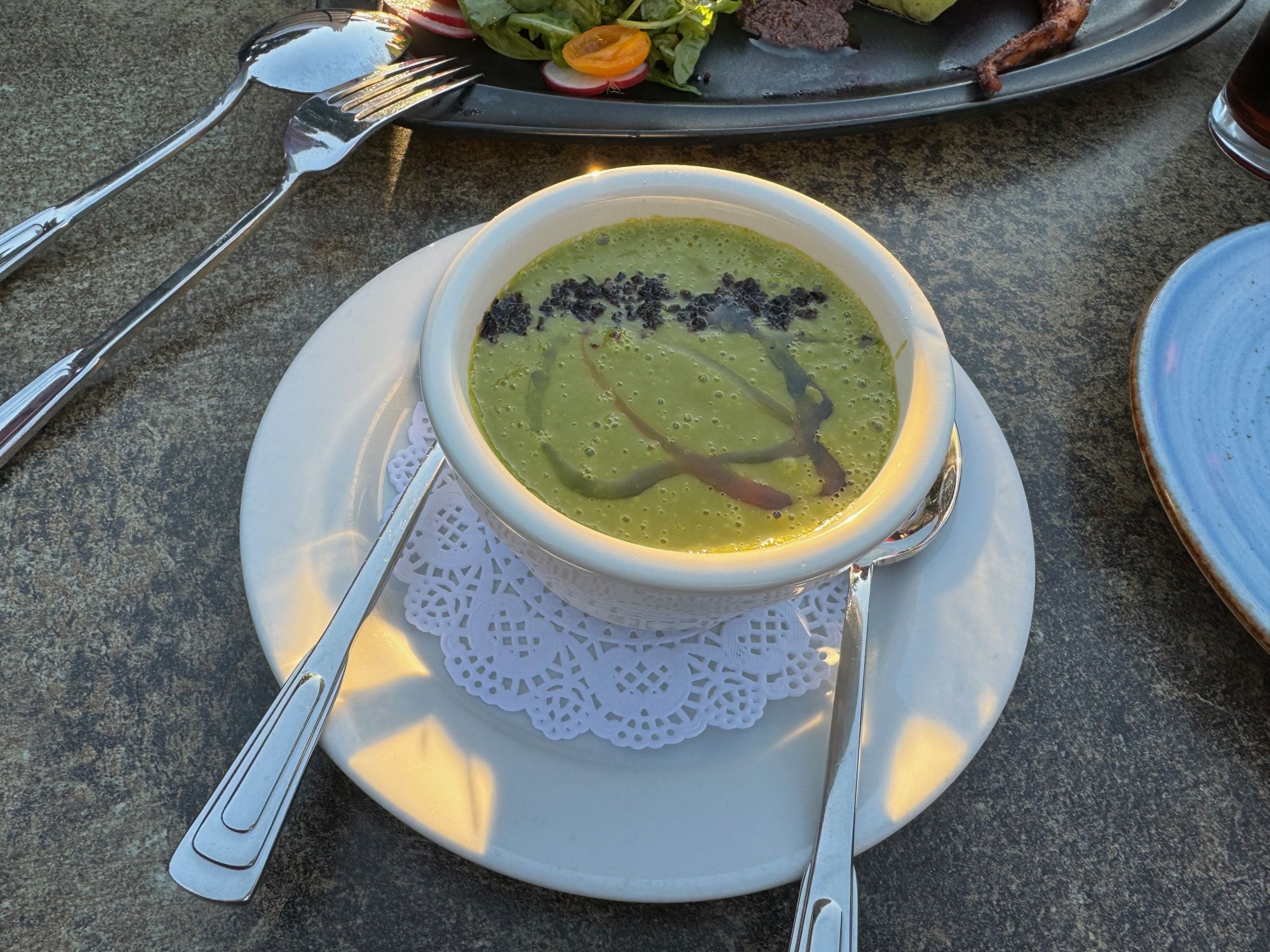 Detailed descriptions, please for the first, (which looks amazing), second (the soup - what is it?) and third (am curious about the sauce; fish and potatoes are a classic combination) pictures.