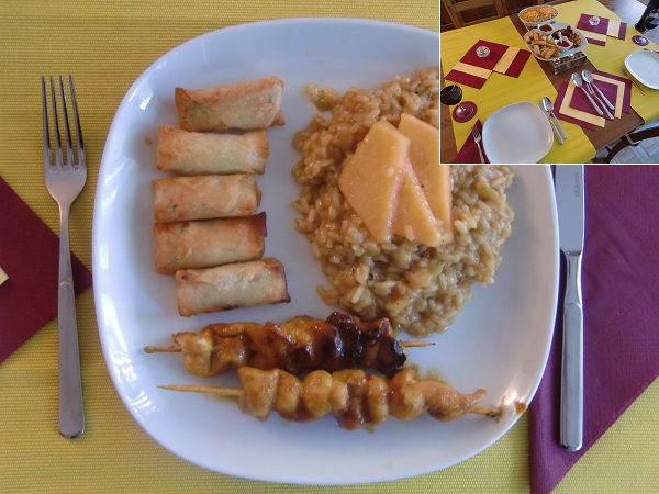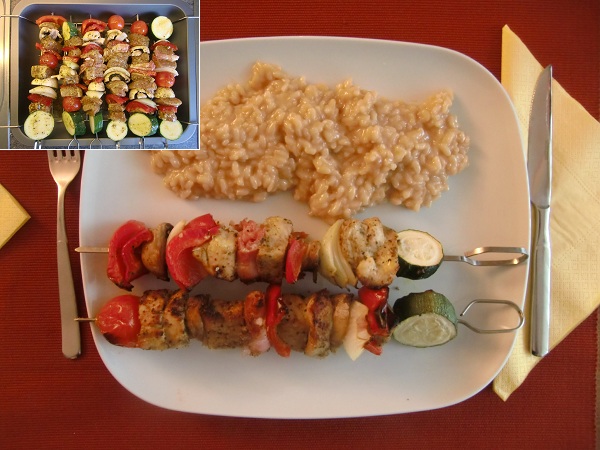 Made lime and garlic chicken shish kabobs with yellow, red, and orange peppers, mushrooms, and onions. With some steamed corn, salad (not shown), and ripe seedless watermelon.