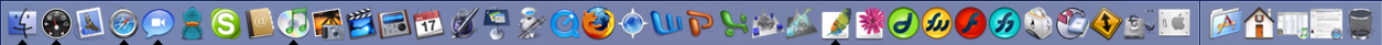 Most of my apps should be pretty easy to recognise, but in case anyone's in any doubt they are, from left to right... Finder, System Preferences, iTunes, iCal, iPhoto, Address Book, Mail, Safari, Adium, Quark XPress, InDesign, Photoshop, Illustrator, Acrobat, Pages, Excel, Football Manager, The Sims 2, Star Wars: Knights of the Old Republic.