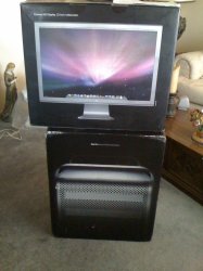 Ok, on Monday, I bought a Mac Pro along with a second 23" cinema display. I took a few photos but I was lazy and figured I would finally post them, Oh and excuse the room, the house is being remodeled and the "desk" is temporary.
