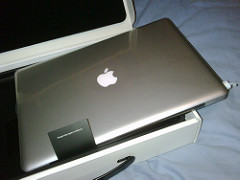 Friday, Apple replaced my MBP 2.4 Santa Rosa with the new 2.53 after lengthy push and shove and about six weeks of me not having my Mac. The size difference is negligible, a millimeter here and there smaller but a few grams heavier. I kinda feel like the guy who gets upgraded to first class on his next flight after his luggage is lost. The old one had my more preferred familiar matte screen, for I fear change and obviously having shiny iPods and phones and so on wasn't enough to convince me to move to a shiny screen last time.