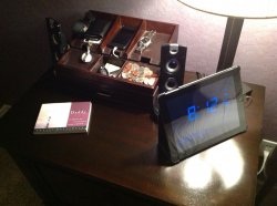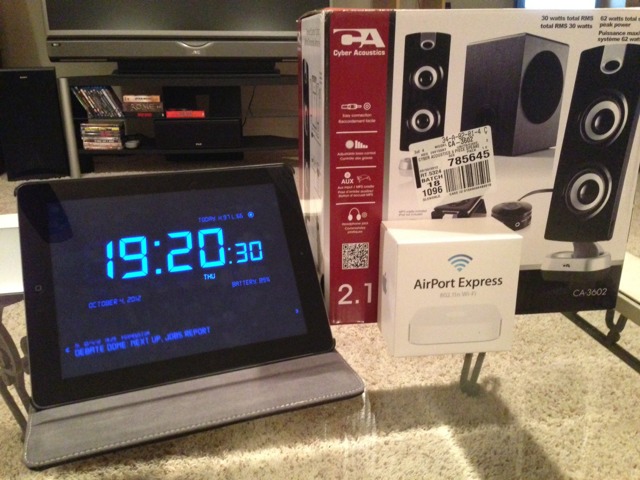 Thanks to lightning, I'm done with docks. This is my new alarm clock and bedroom radio. Cyber Acoustic CA-3206, AP Express, and an old iPad. Airplay streaming from now on for me.