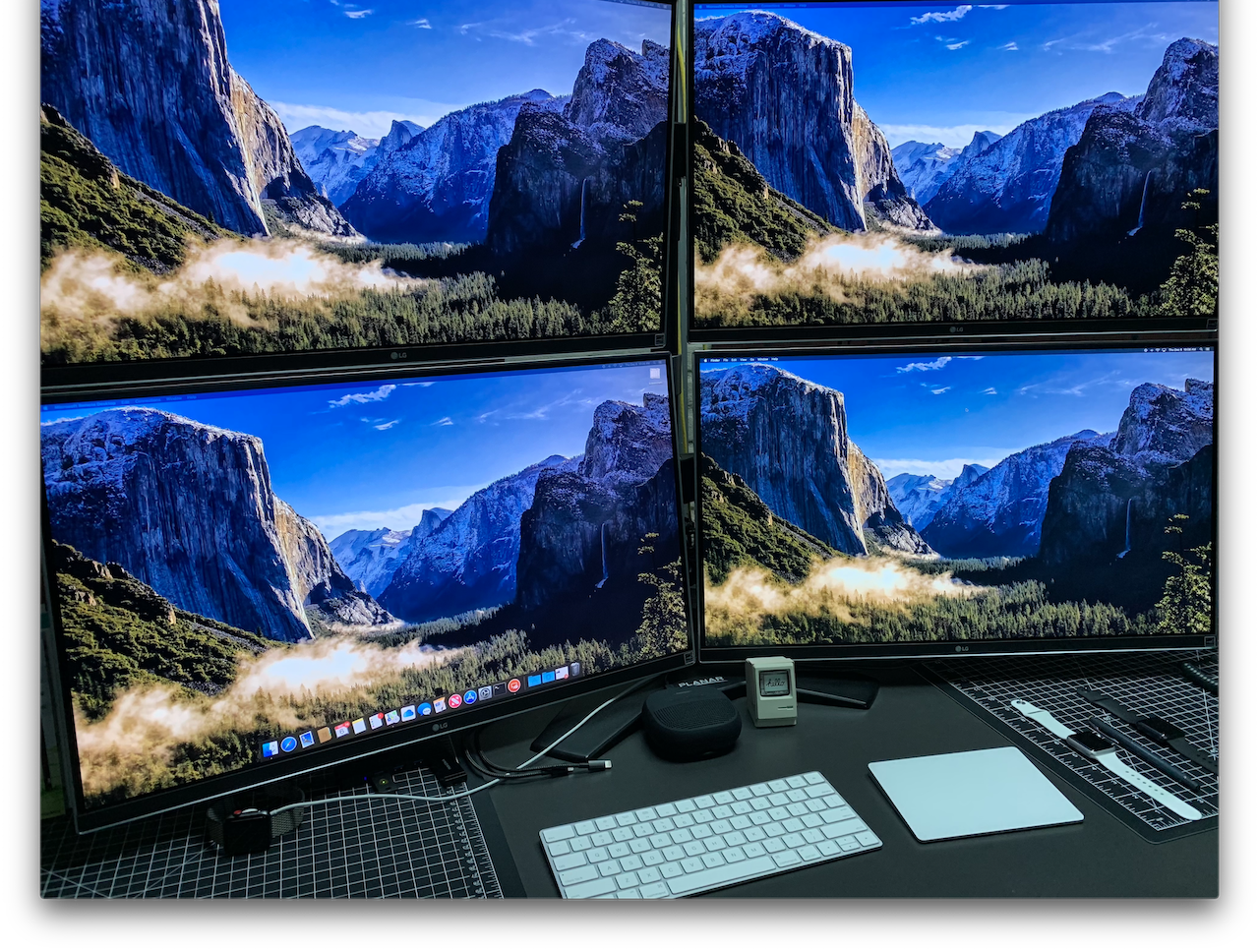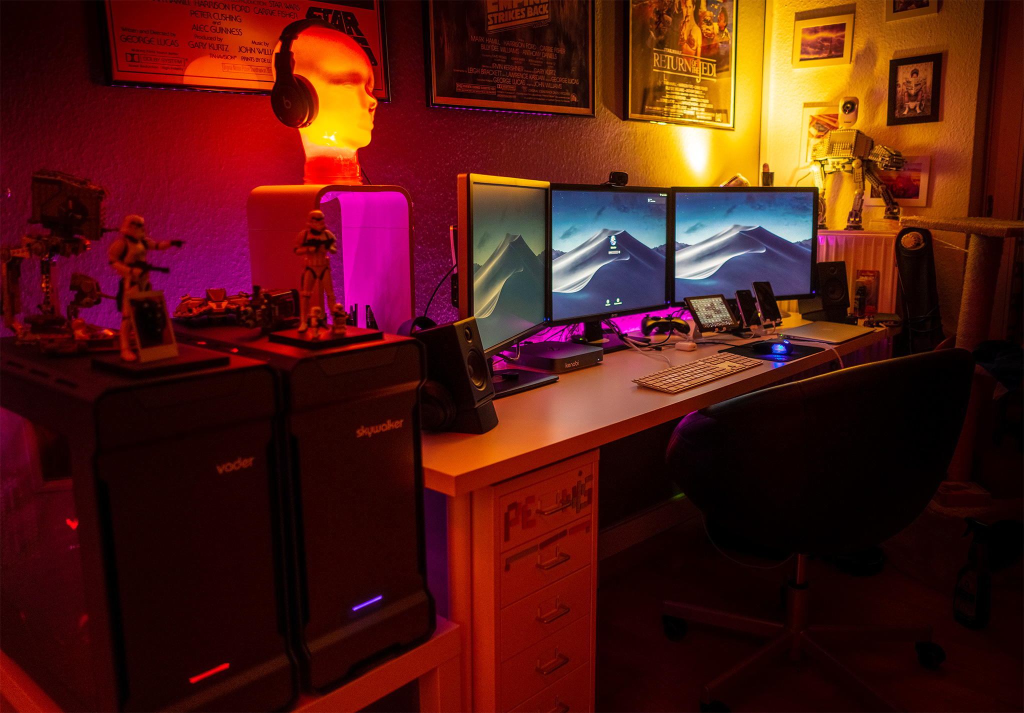 Here's my main home desk with some of my computers. In the middle you can see my new Mac mini Kenobi with its invisible Glory Blow Hole (see Mac mini i7 temps thread). On the left is my gaming PC (and Hackintosh) Vader, then my former main Hackintosh Skywalker, on the right invisible behind one screen is my home server C3PO, in front of the screen my little good old Macbook Air Leia.