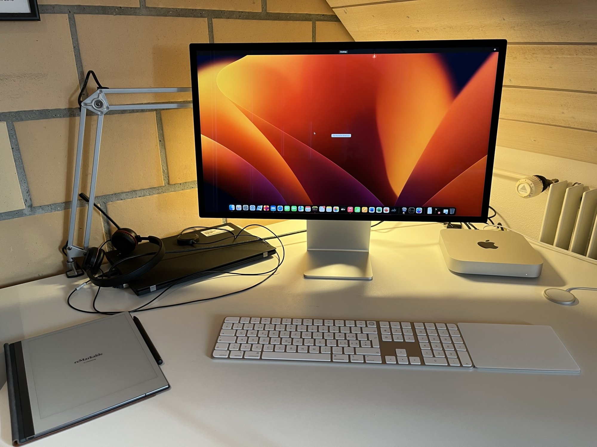 Current homeoffice setup. M2 Mac Mini Pro 10/16/16 1TB and Apple Studio Display. I hook up the ASD (manually) to my work Thinkpad during office hours. Both computers connected via ethernet to router. External SSD and external HD plugged into the Mac Mini, as well as a Scansnap scanner. Laser printer is connected wirelessly. reMarkable2 tablet for notes and annotating pdfs.