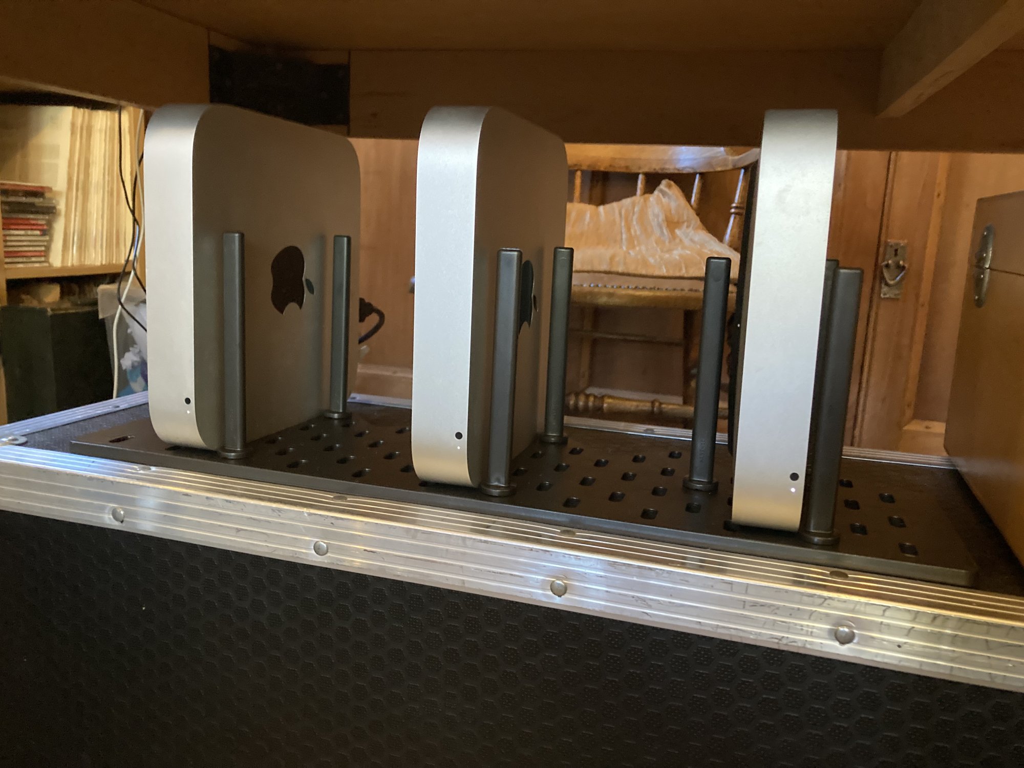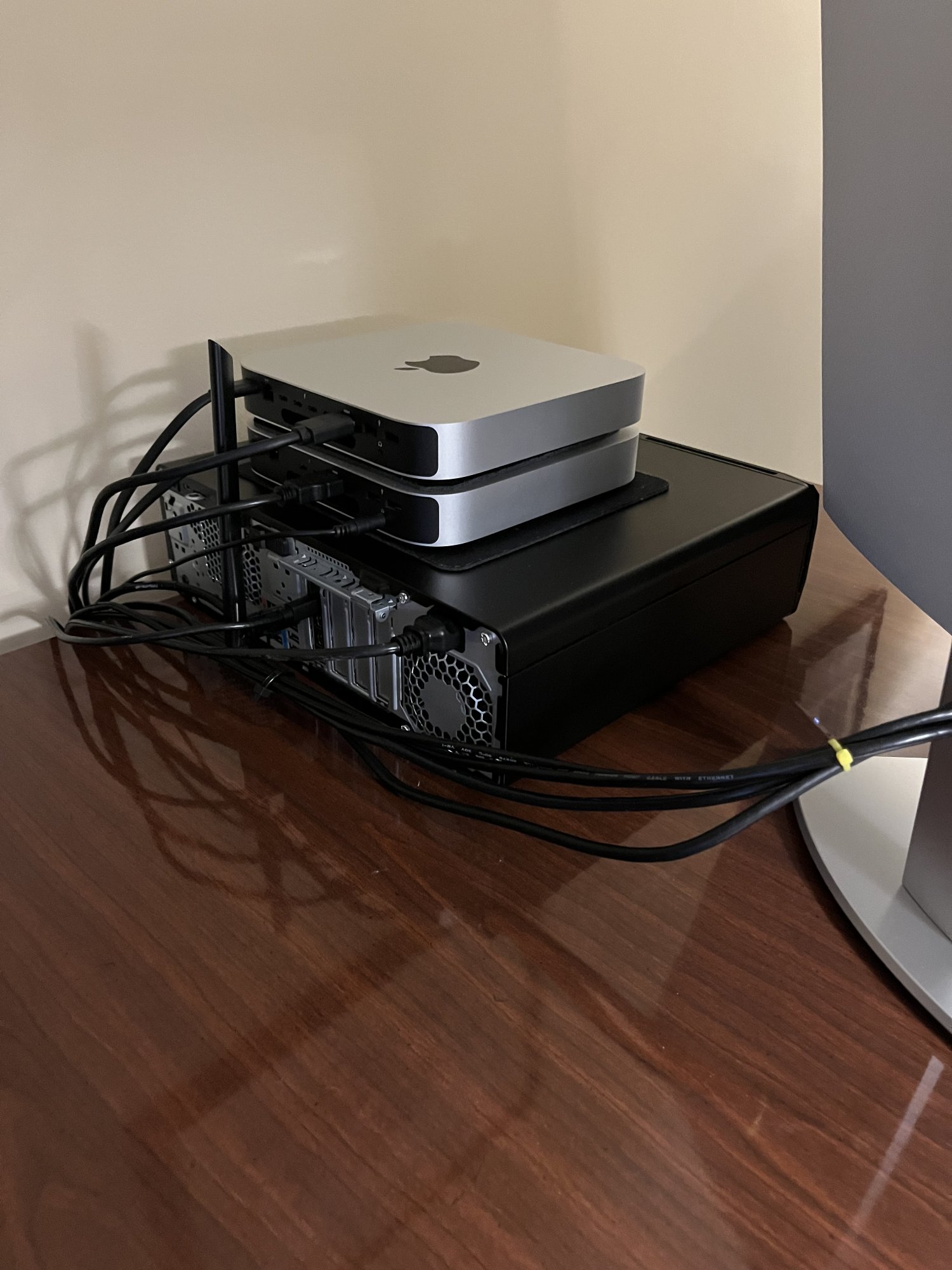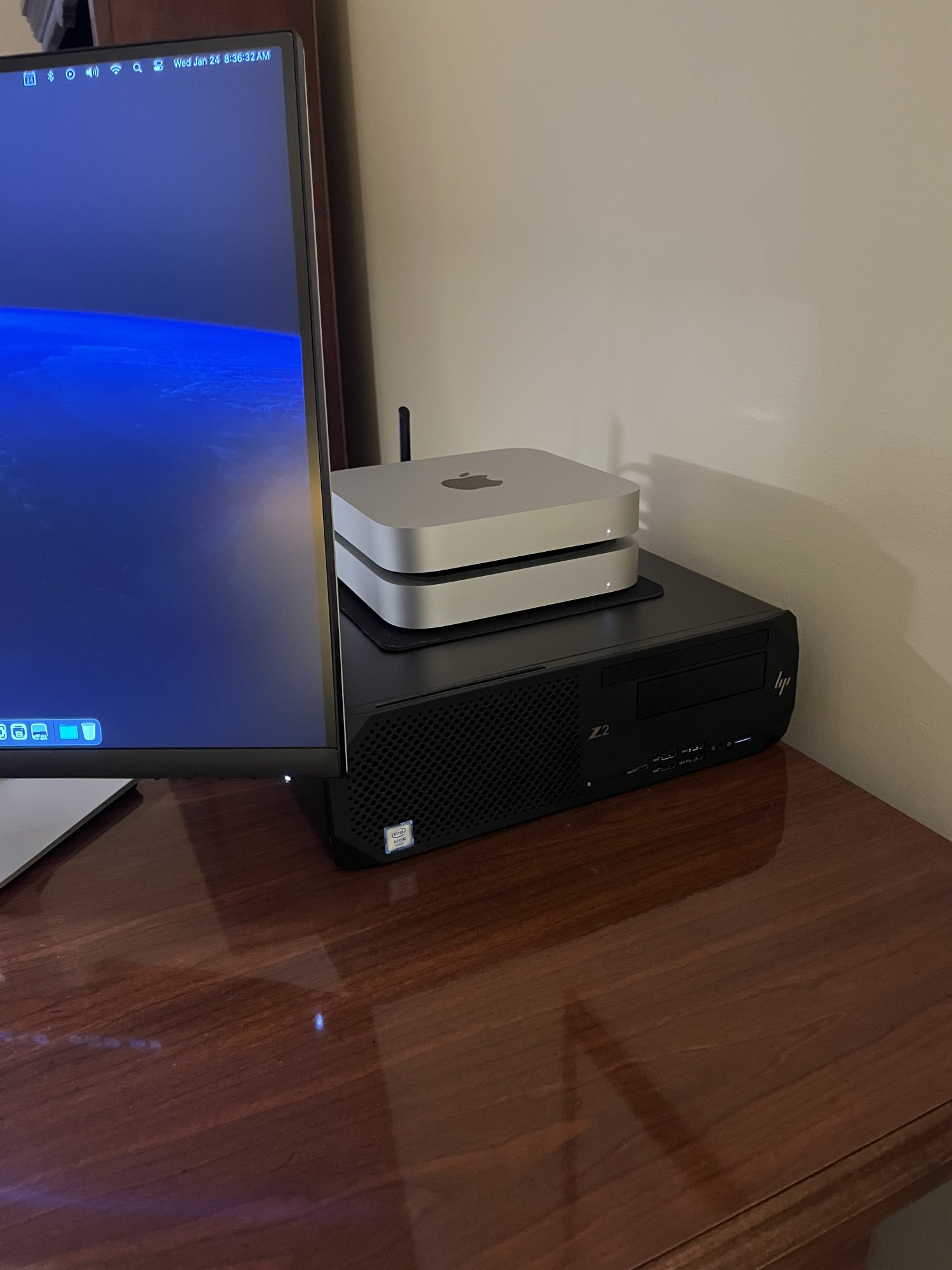 M2 Pro base sitting on a M1 16GB /256 (music streamer for my office) sitting on a HP Z2 Xeon Workstation.