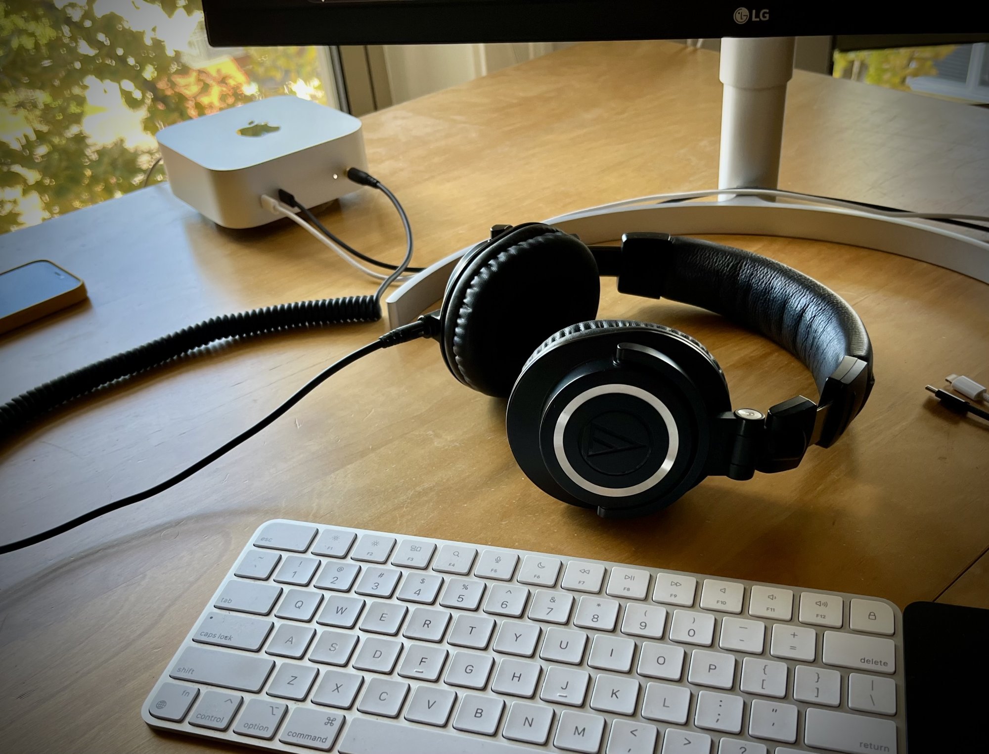 Those are my very old and very affordable, and very well-reviewed, Audio-Technica ATH-M50X monitor headphones and I think they sound great with the Mac mini or with an Apple USB-3.5mm adapter on my iPad or iPhone.