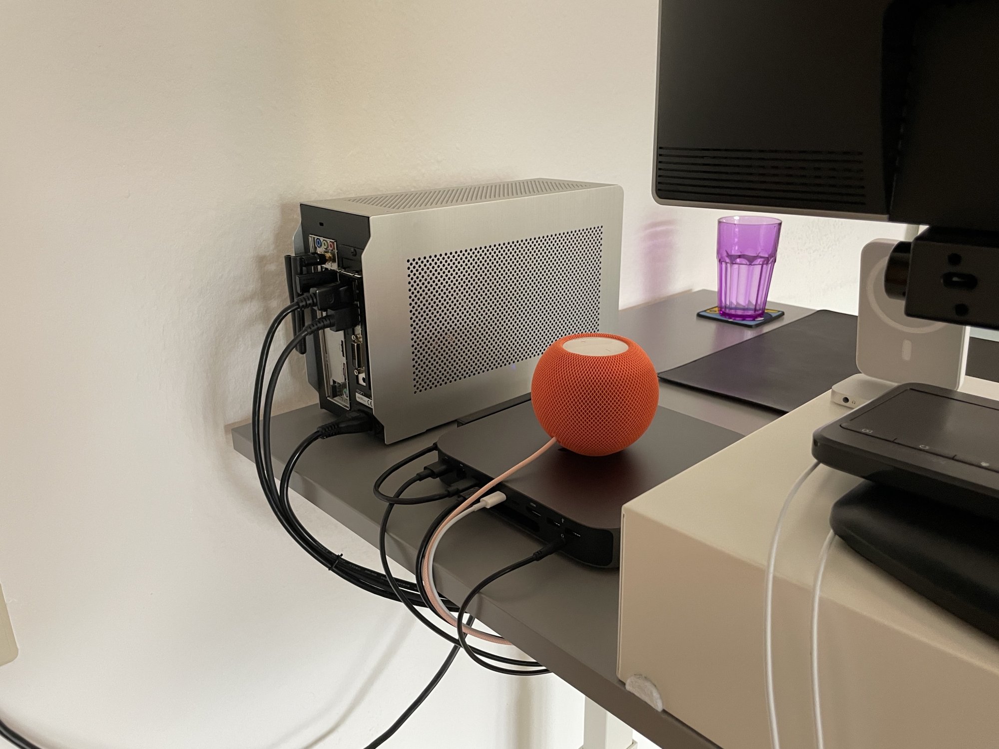 Here's a close-up of the Mac mini with the SSD attached to its side and the HomePod mini on top:
