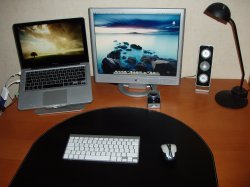 My current setup as of late, I love large desks that I can grow into, right now it houses my 12" Powerbook G4, but within a year I hope for it to support my 27" iMac, secondary display, Printer, and a small docking station for my current Powerbook/future Macbook.