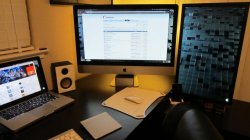 Here are a few shots of my current setup for CCNP/VMware labs. It is a little messy, but it gets lots of use. The keyboard is attached to the air, which acts as a synergy server, and the pro a synergy client. Behind the center monitor is a little TV facing a futon against the wall. Unfortunately, I will be loosing my office soon to a new roomate, so I wanted to capture what it looked like before it gets torn apart