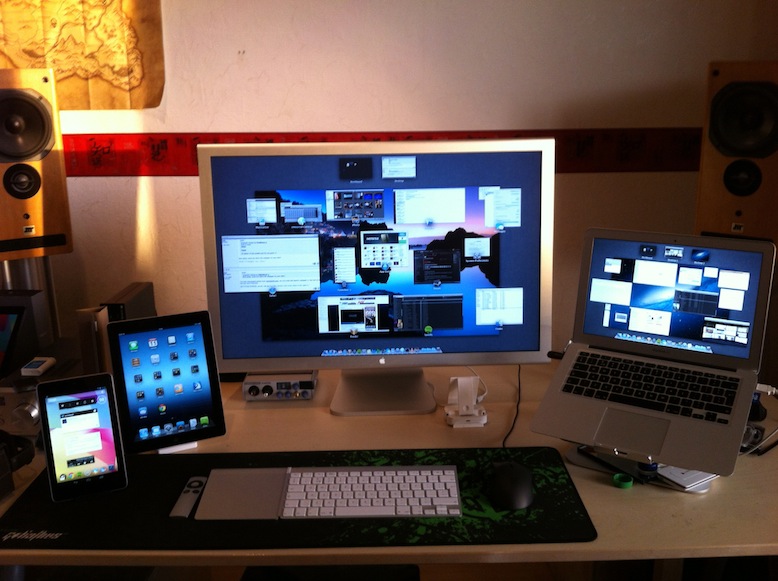 Here is an update since my last post. I did some cable management, moved around my hard drives to to make room for the Book Arc for my retina (should be in Tuesday), and also added the Audioengine A2's.
