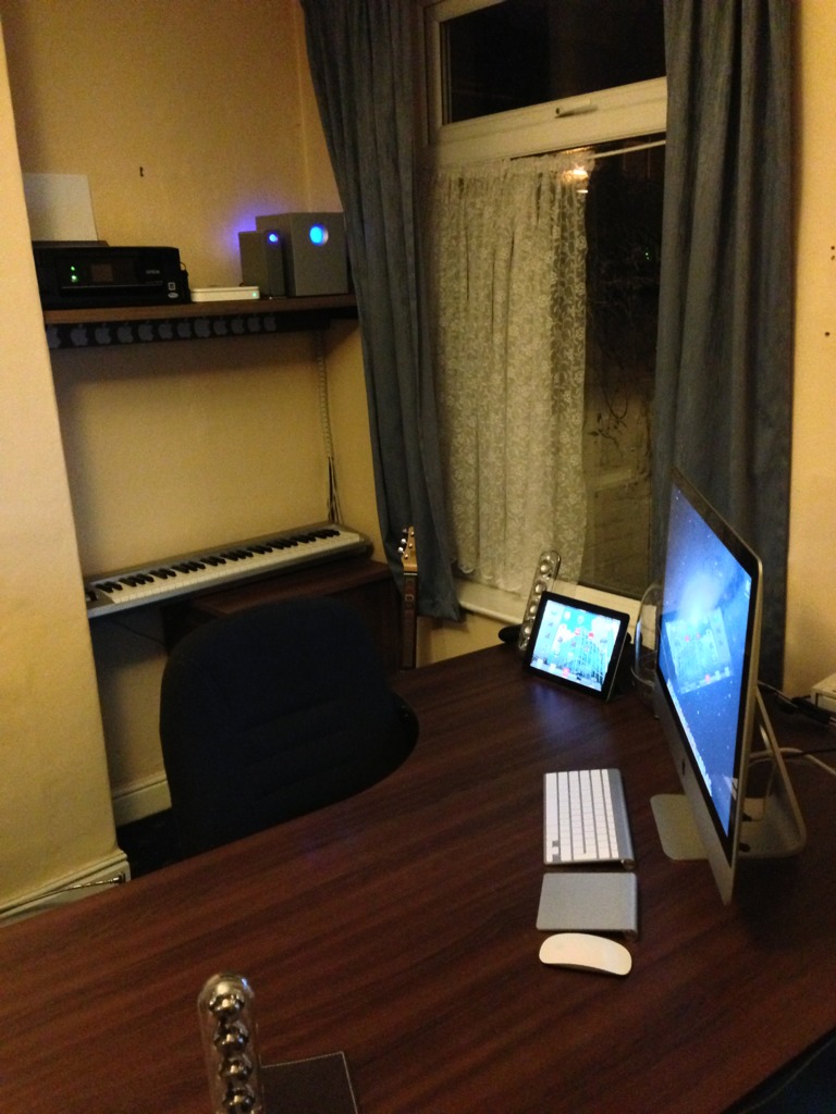 Your desk must be huge, because your 27" looks tiny. Nice set up BTW. I need to take some shots of mine now I have finally got my iMac, but need to reorganise a bit first. My desk is a mess (to be fair to mw, mostly because of my wife & daughter!)