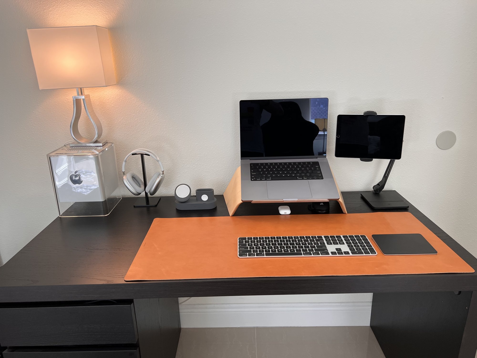 MacBook Pro 16" M1 Pro on a generic metal stand, 27" ASUS 4k ProArt Display, iPad Pro on the Twelve South HoverBar Duo. New Magic Keyboard with TouchID + Numeric keypad and Magic Trackpad 2, both in the new silver and black combo. Can barely see the trackpad on my desk right now!