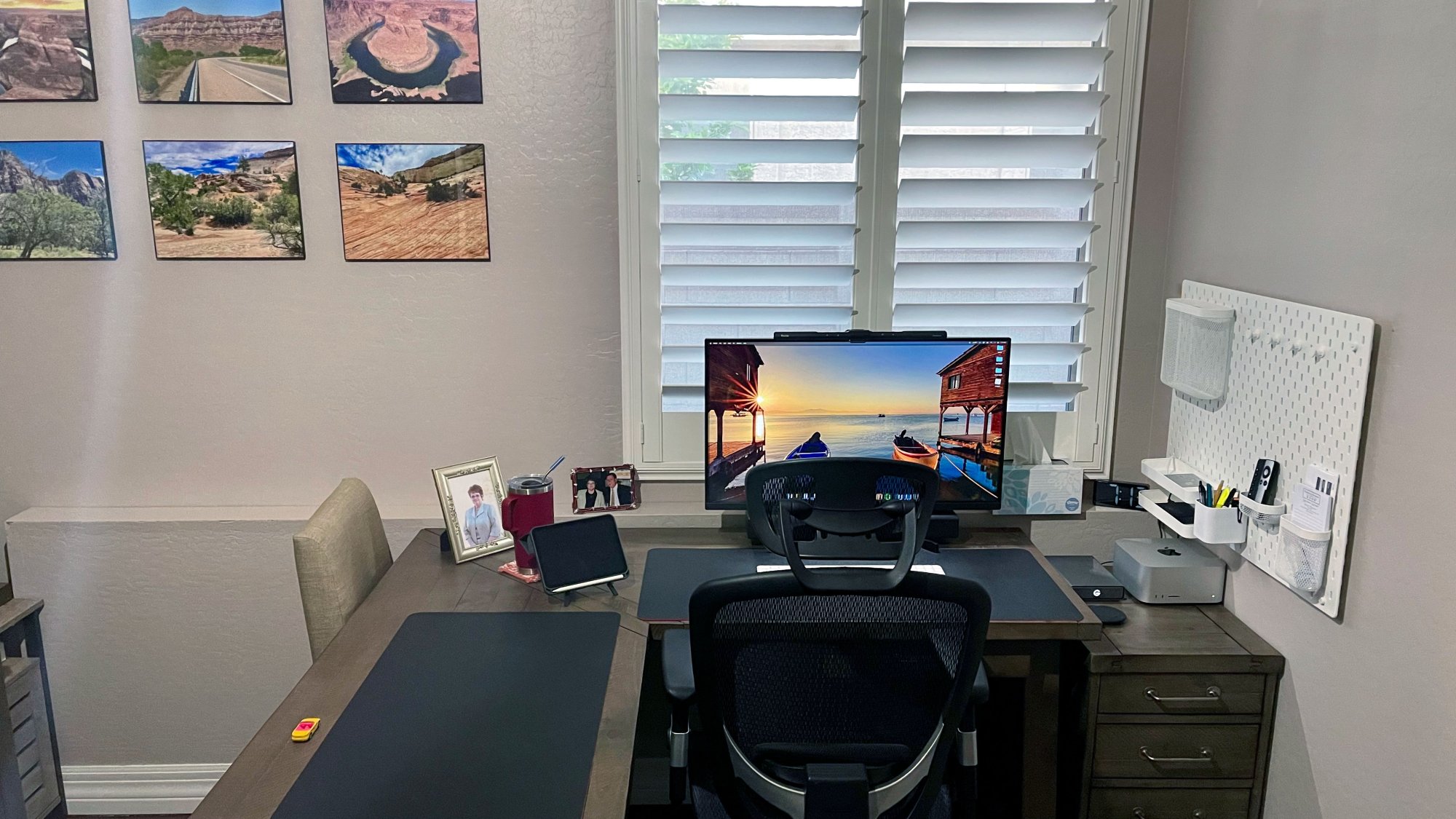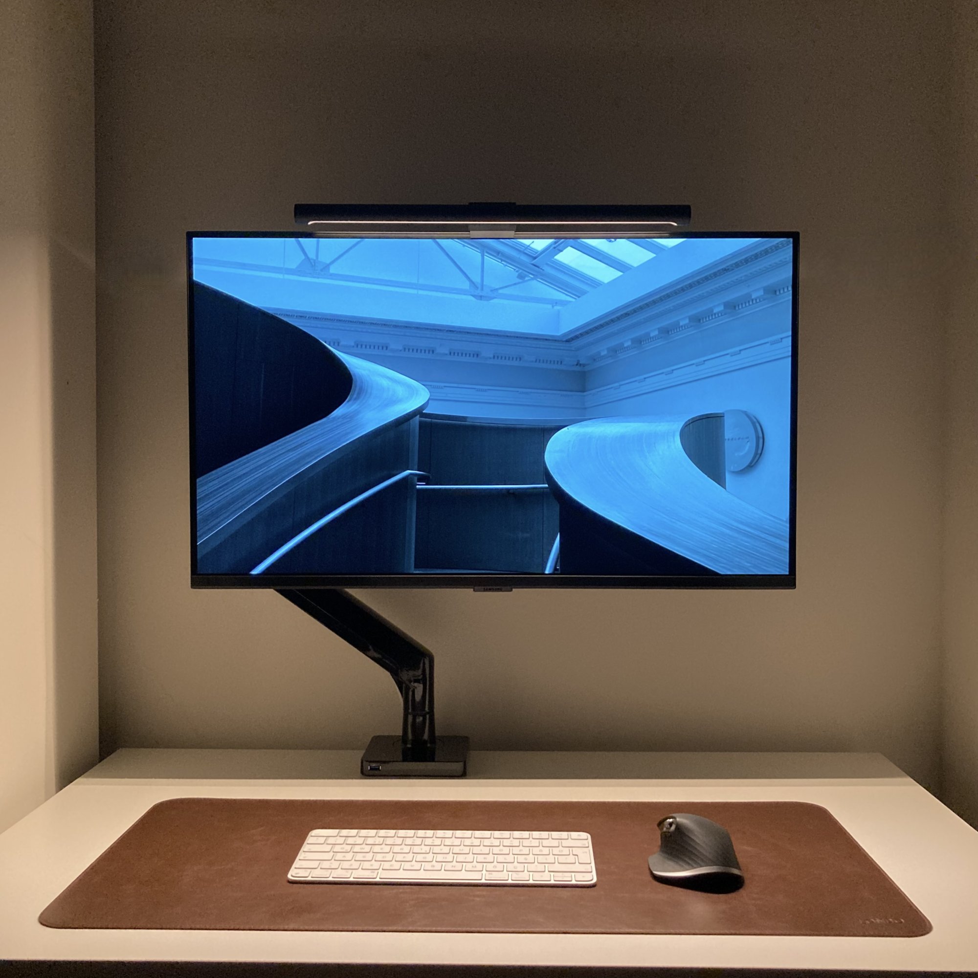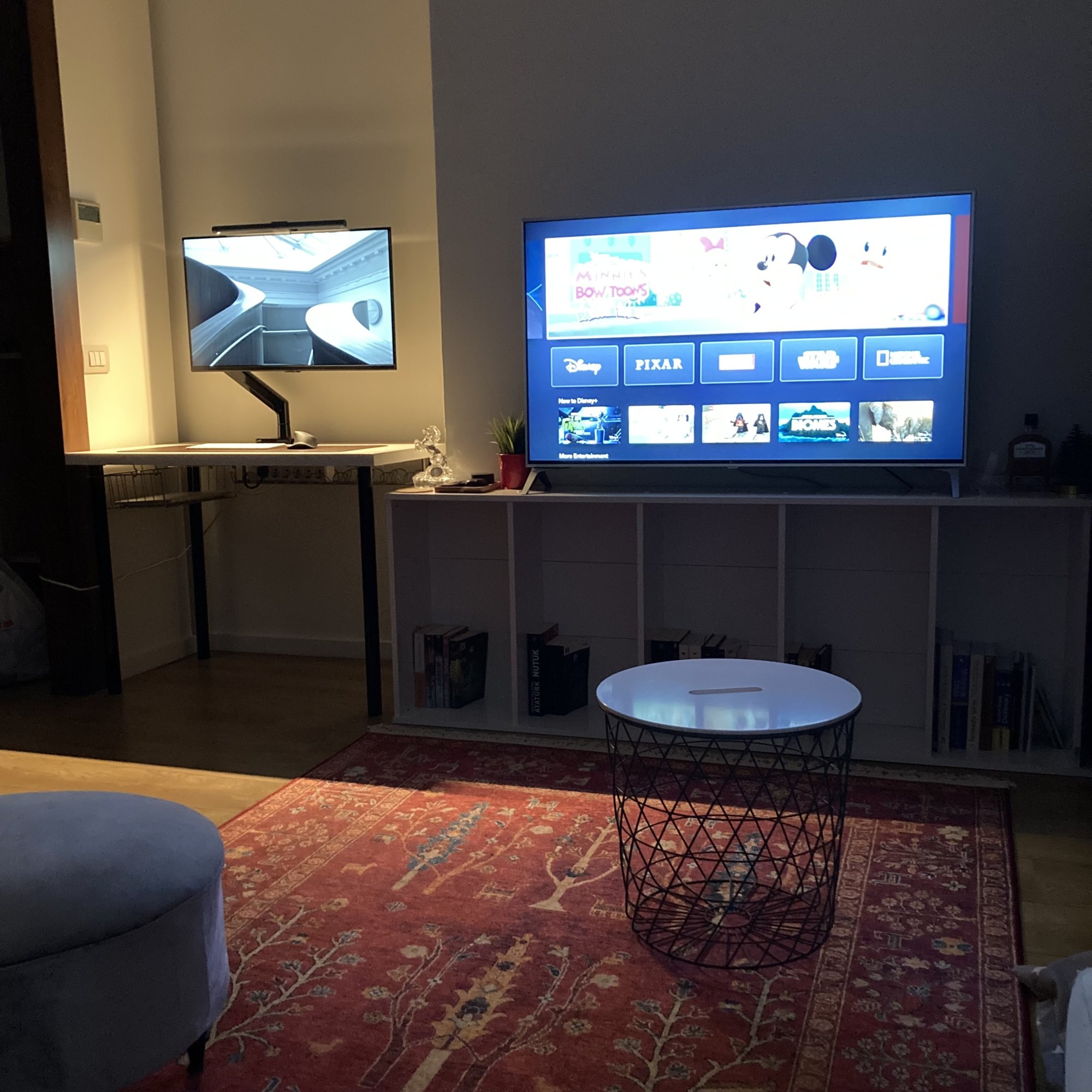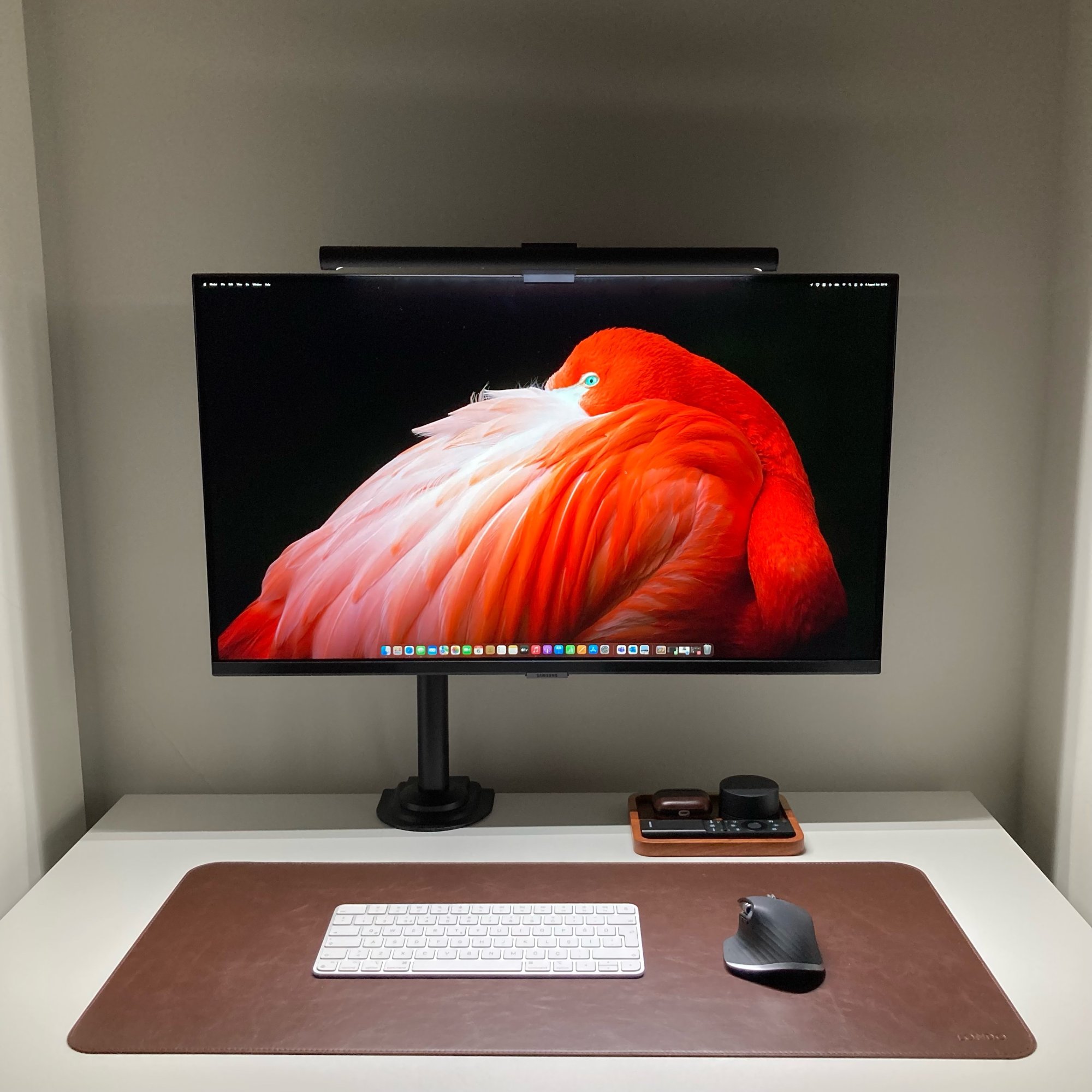 Here's my setup in my new apartment! I'm currently running an M1 Max 16" MacBook Pro with a 20" Apple Cinema Display, which is still a phenomenal display nearly 20 years on.