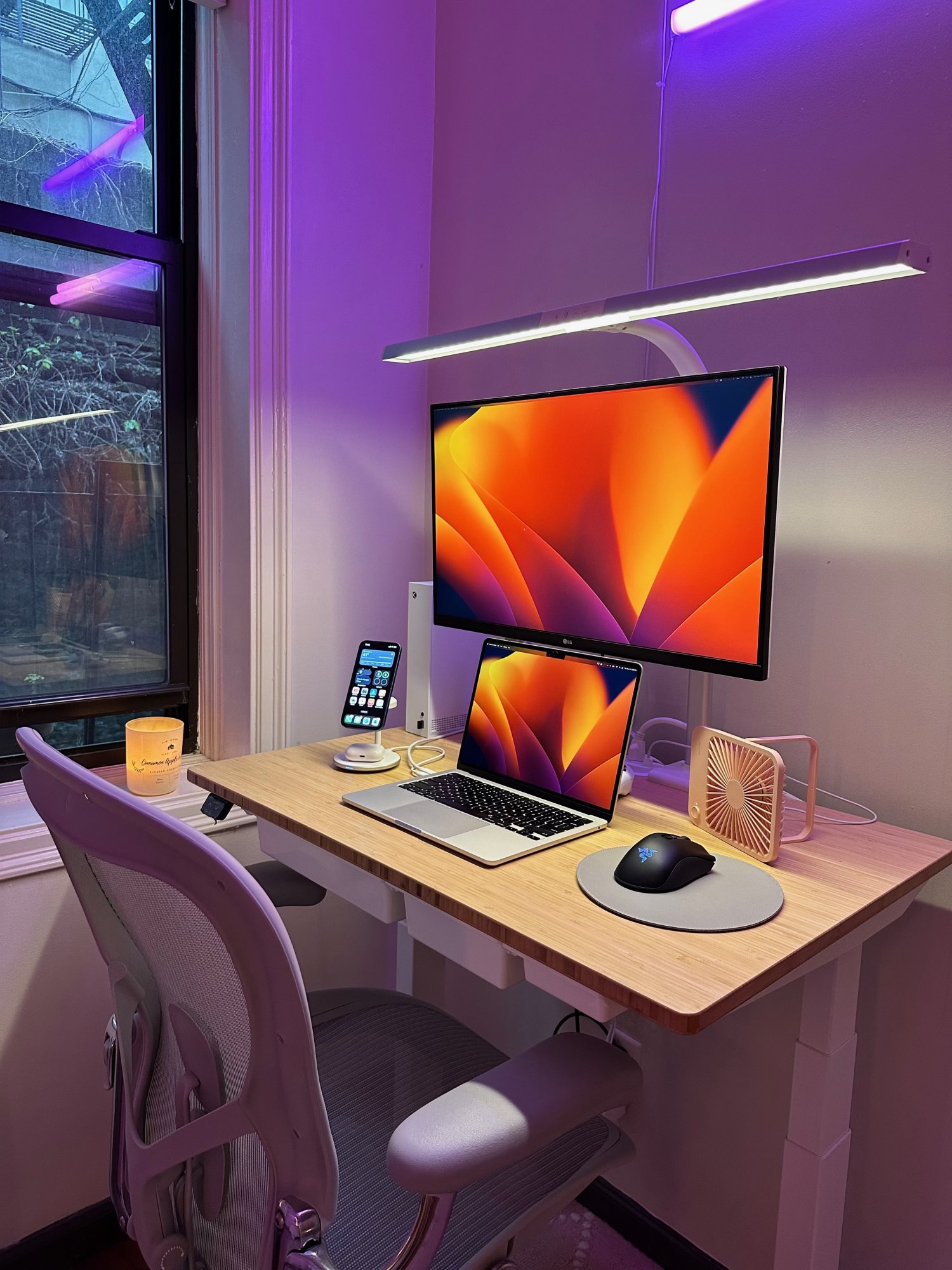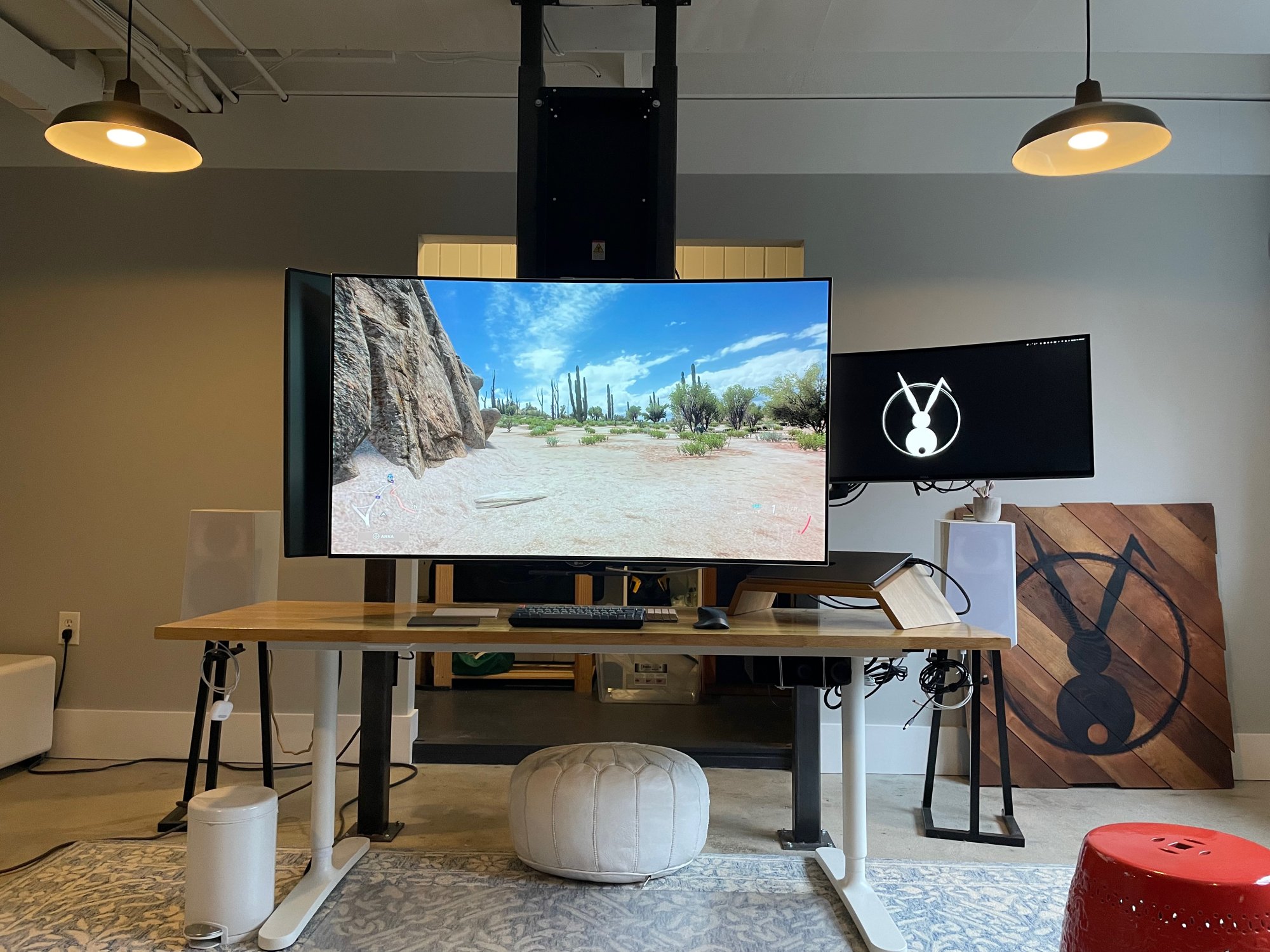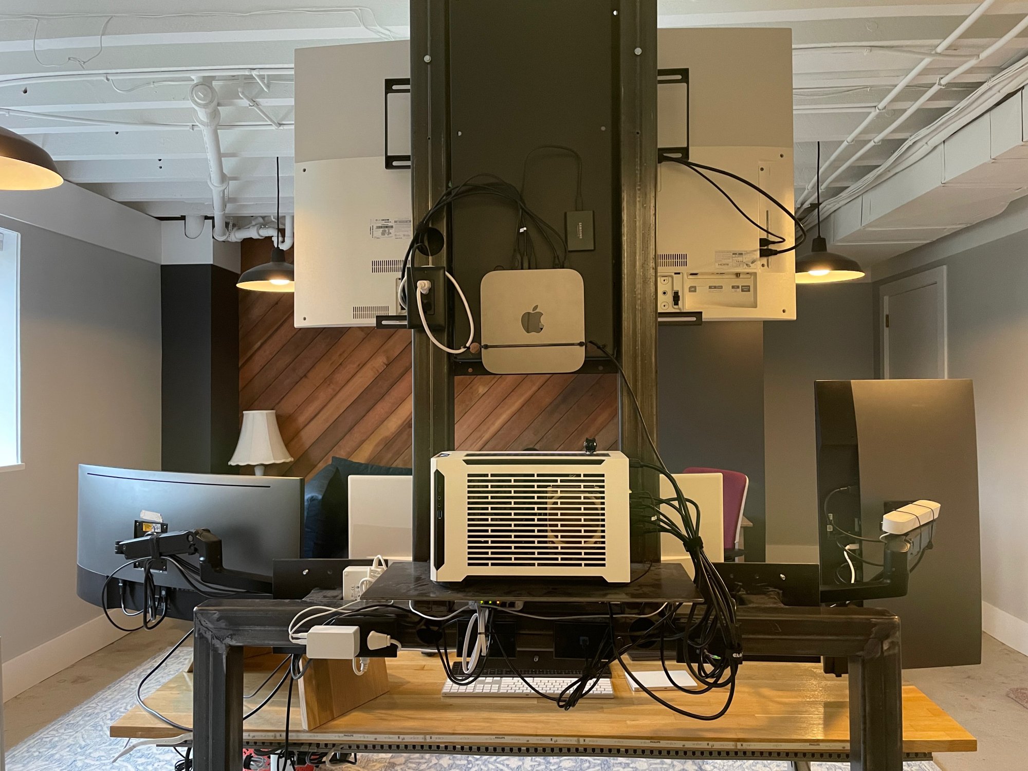 Most have 3 different machines hooked up, but I'm using the M1 MacBook most of the time. Mini at the back is more for streaming if I'm connected to a VPN I don't want to saturate. TV comes down on an arm when you want to play games or whatever.