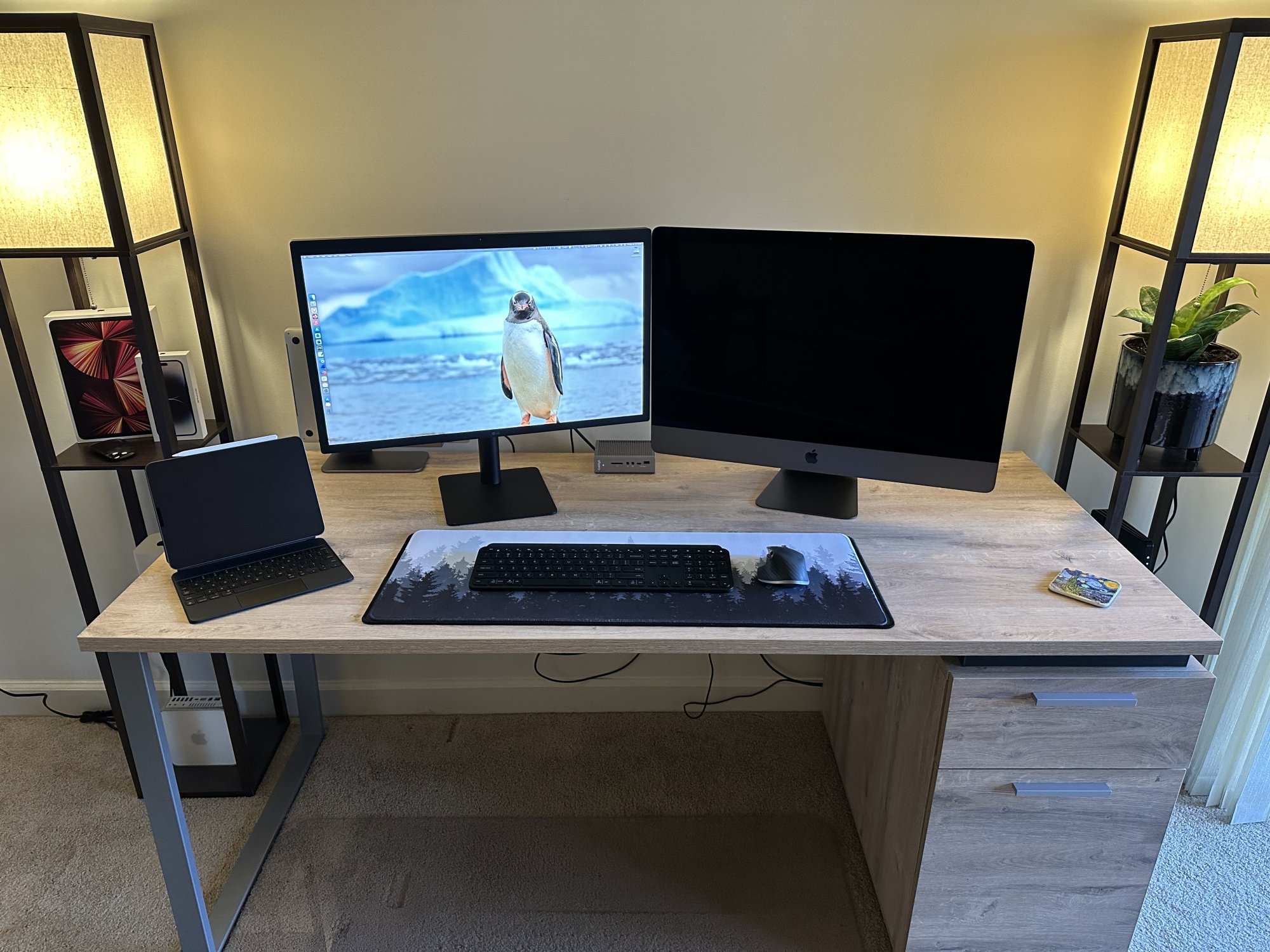 Put together a new desk. Still got some tidying up to do with the cables. On the right is my work iMac Pro, left is an LG 27-inch UltraFine 5K hooked up to a 2019 16-inch MacBook Pro. This laptop will eventually be replaced by either a Mac Mini (if refreshed and can get 24 or 32GB of RAM) or a base Mac Studio. Still got some work to do with the overall set up of my office space, but its coming along nicely.