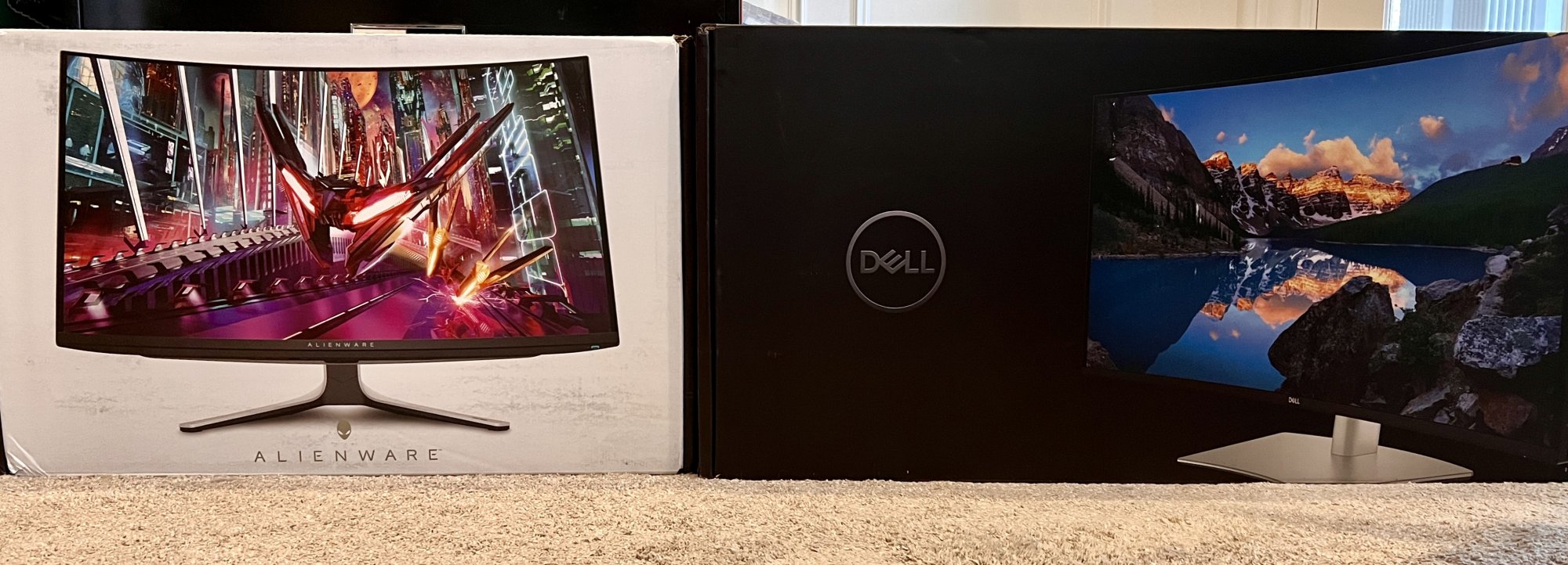 (Gray "Pro curves" wallpaper is my personal Mac Book Pro connected over Thunderbolt to the Dell, which then has the Alienware through it, the prism wallpaper is my Mac Studio over HDMI to just the Dell.)