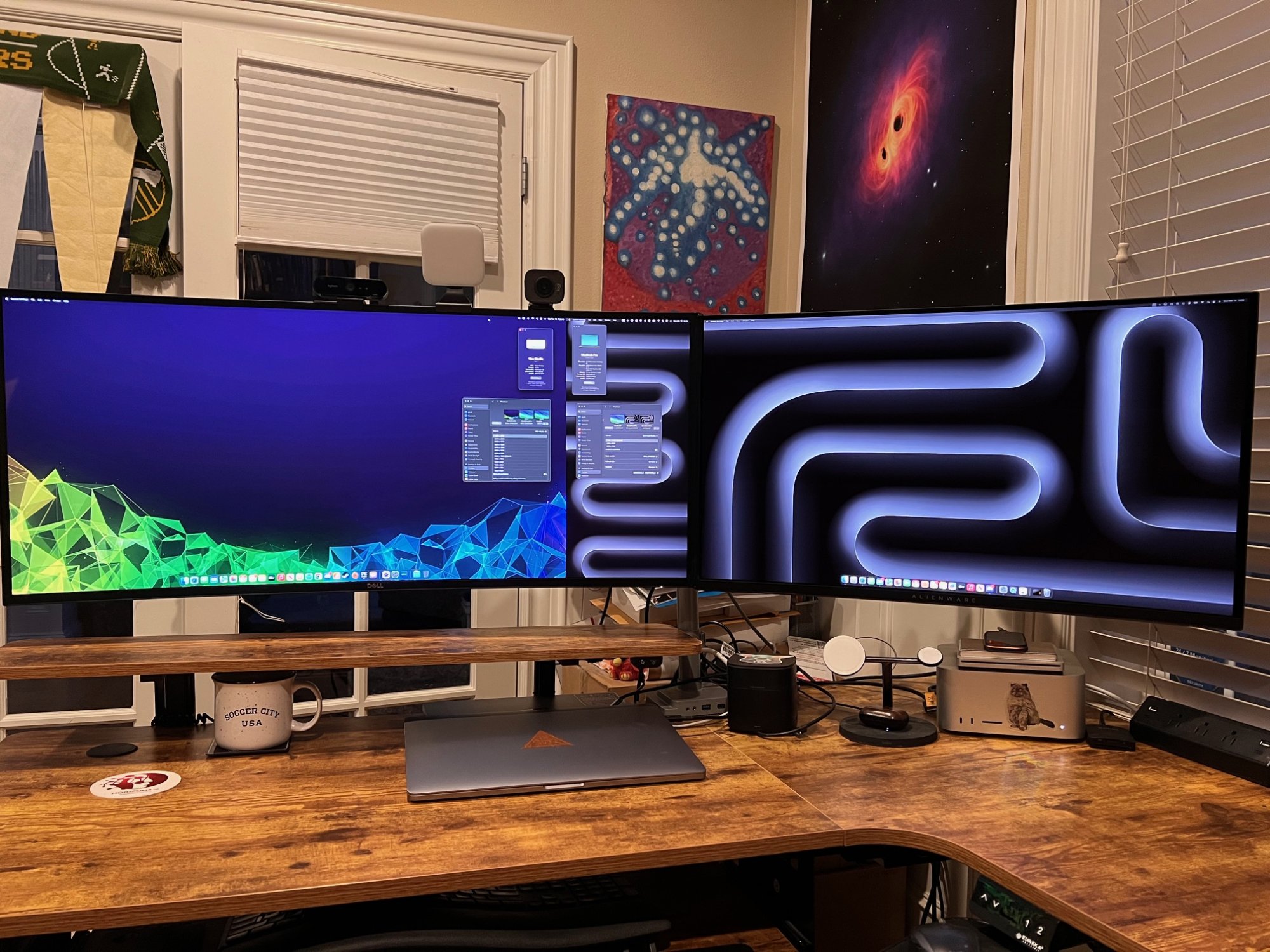 At right is my personal Mac Studio. Currently have it connected to my HP Thunderbolt 3 Dock (black box thing with a Grogu sticker on top to the left of the Studio and phone/watch charger.) That is connected to the Dell 40" via HDMI, and the Alienware 32" via DisplayPort-to-USB-C plugged into the dock's Thunderbolt out port.