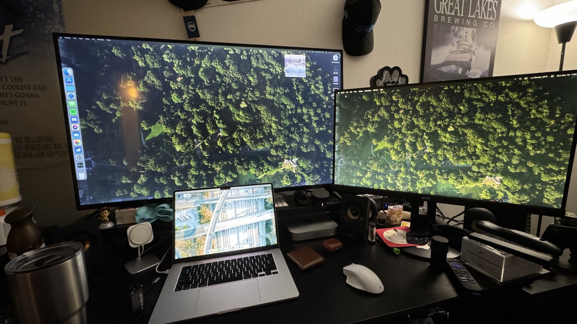 macOS "Continuity" mode really makes this work well. Unfortunately, I can't log in to my work laptop with my personal iCloud, so I can't have my work laptop taking up "most of it" with my personal machine taking up the sliver. But I do have my Logitech "Flow" equipped mouse+keyboard, which can do similar, just not as seamlessly.