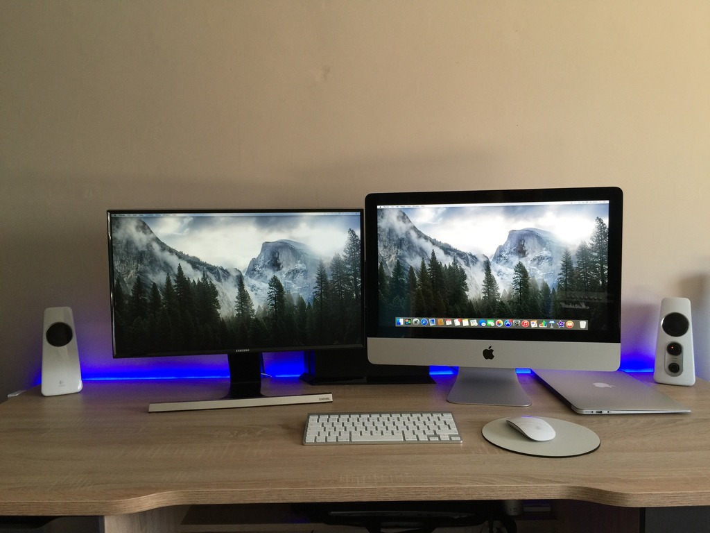 Nothing fancy but thought I'd contribute ;). The second monitor was initially just for the PS4 (pictured behind) but decided to make use of the dual HDMI input and hooked the mac up too :cool: