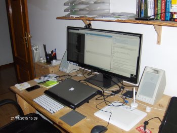 My work setup is much the same as above with a standard Apple Wireless keyboard, Samsung 22" displays and none of the external hard drives.  The Mac Mini is the same spec with a smaller SSD.