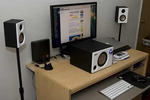 HOWEVER, the placement that ghostchild has is CORRECT. While the sub doesn't play past 100hz much, anything above 70-80hz is directional, which means the system sounds best when the subwoofer is placed directly in front of the user. The system isn't meant to play loud; it's meant to play accurately. The subwoofer isn't a subwoofer in the traditional sense of a big box that gets thrown in the corner and blows the roof off. Think of it as just reinforcing the lower octaves. If you don't have the subwoofer on the desk, it sounds like crap.