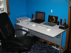 I love your setup; however, I would put the MP on the groud. IMO it takes up too much desk space, but this is coming from someone who hasn't had a desktop in 5 yrs....