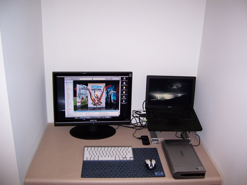My apartment has a little office nook. The only problem with the current setup is I have to pull the MacBook out whenever I want to put a disc in, and keep the MB pulled out until I remove the disc or else it will eject it into the wall.