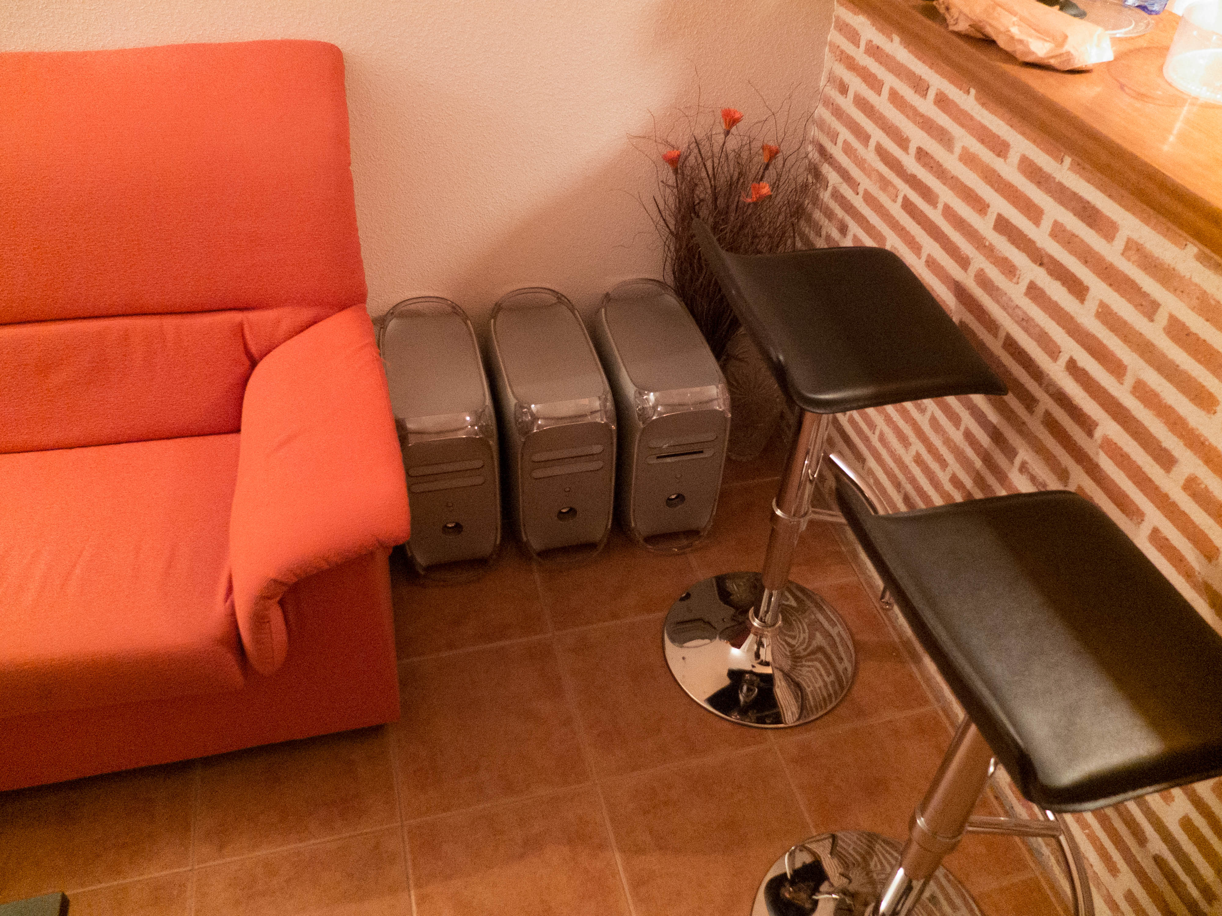 When I need to do repair or addition, I pull the required Mac out from under the desk and prop it on a special plastic folding table I keep for that purpose. A second 17 inch Apple Studio Display comes out of storage and goes onto the desktop. I use that second ADC monitor and a separate power cord and network cable to check my installations without having to re-connect everything in its normal place.