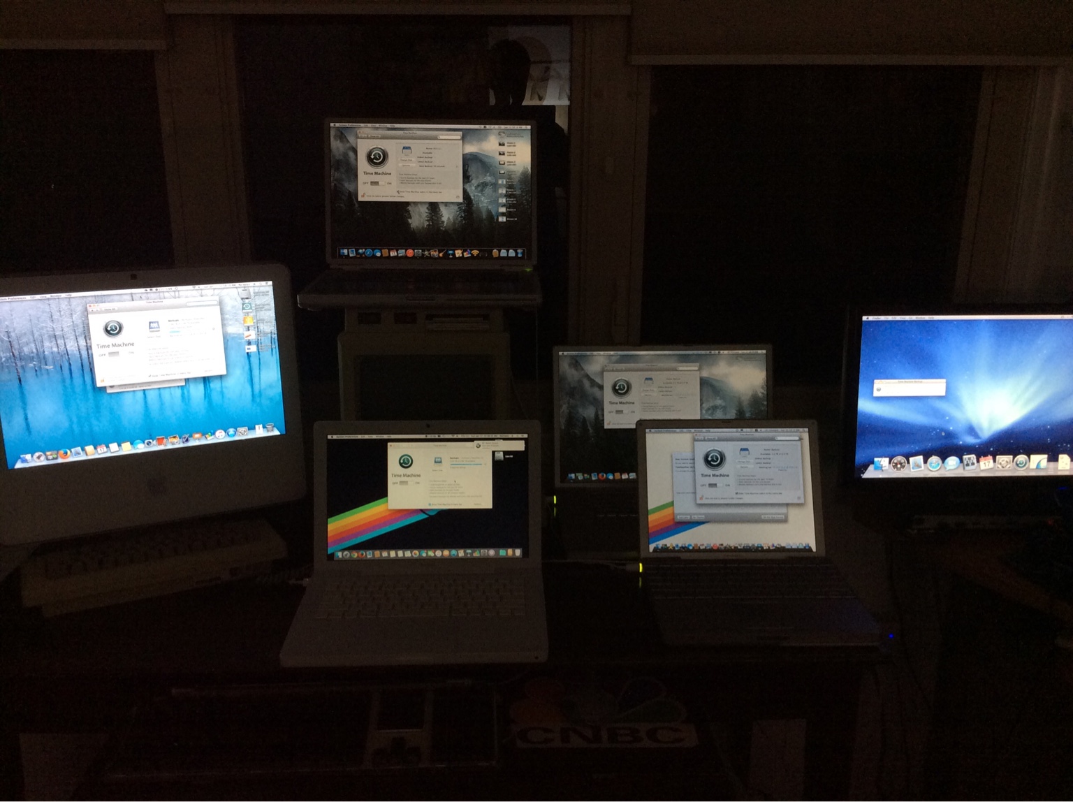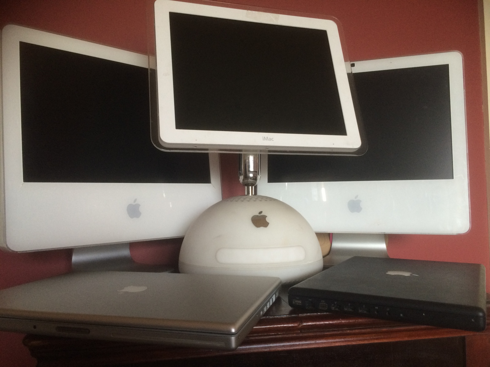 Left to right: iMac Bondi Blue Rev B/512mb RAM/OS 9.2.2, Powerbook Wallstreet 300mhz/512mb RAM/DVD/OS 9.2.2, Powerbook G4 667mhz/1gb RAM/Superdrive/Debian 8 Mate, Powerbook G4 1.5ghz/2gb RAM/OS X 10.4.11, Macbook Pro 2.26ghz/8gb RAM/OS X 10.11.2, iMac 20in/2.4ghz/4gb RAM/OS X 10.11.3, Black Macbook 2ghz/4gb RAM/OS X 10.8.5 (via MacPostFactor), Powermac G5 dual 2.0ghz (June 2004)/8gb RAM/ATI Radeon 9600/20" Cinema Display/OS X 10.5.8