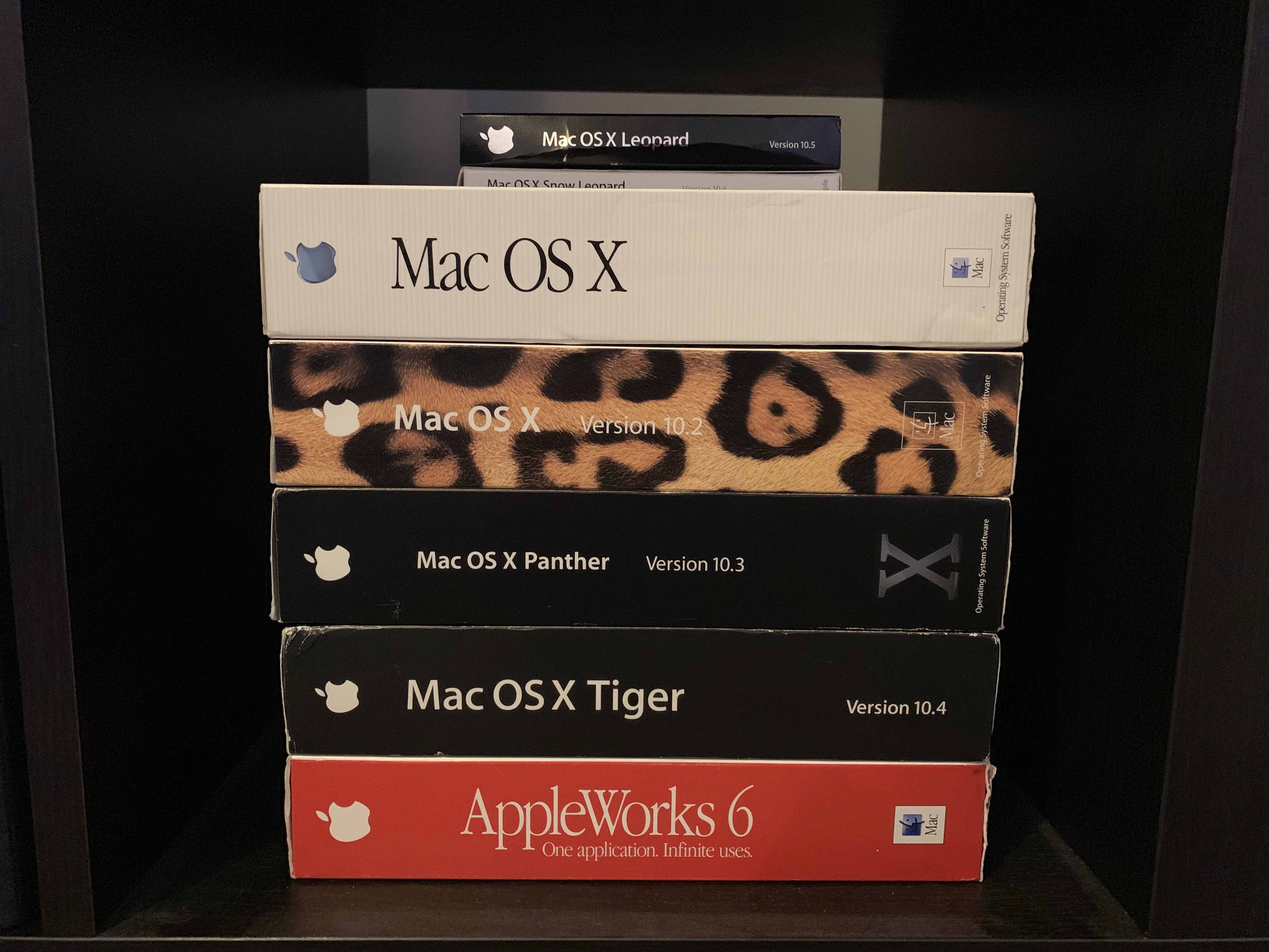 And why not have a stack of PPC OS X versions thrown into the mix. (Just ignore the Snow Leopard disc and we're good).