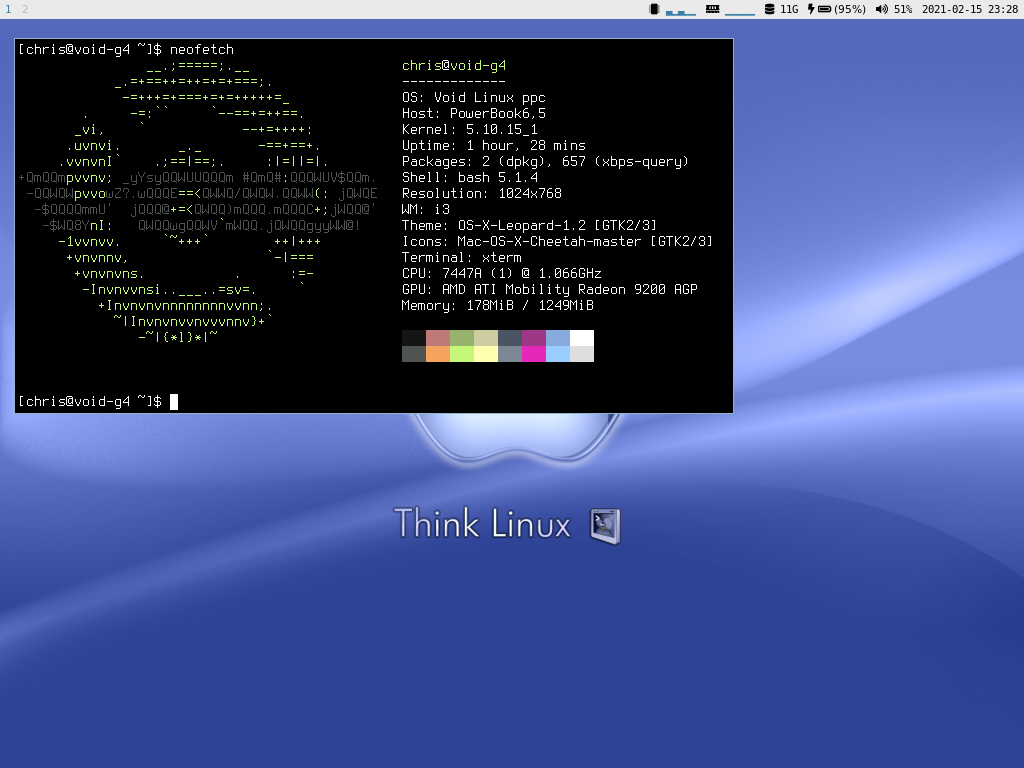Void Linux on the iBook G4. Using i3 wm. I wrote the battery, CPU history, and memory history monitors in the bar.