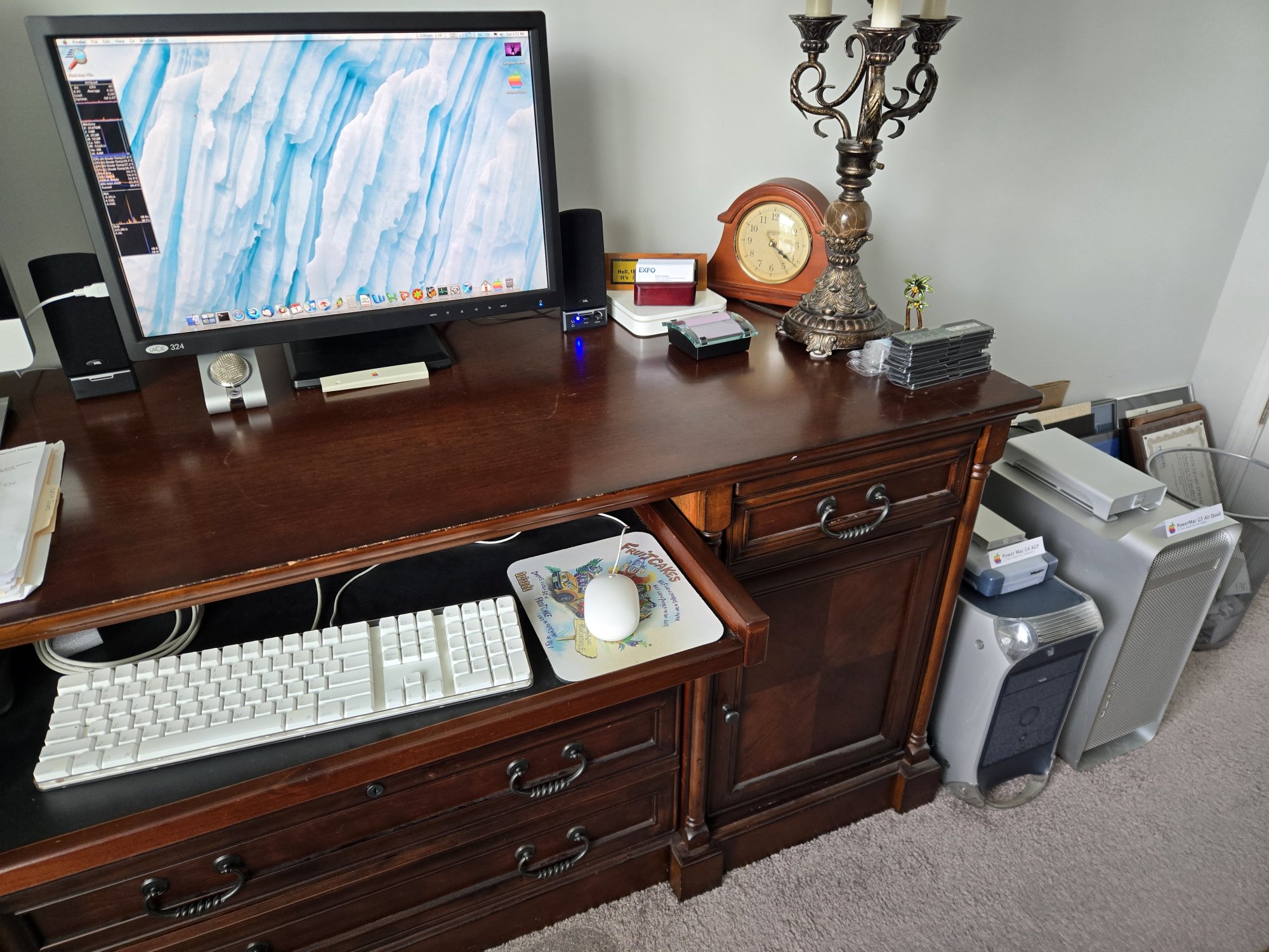 The photo below shows my PowerMac G4, G5 work space. This is where the machines come for testing when they get off "the bench" from being worked on. If you spend a little time with the photo, you will see the G5 (Air) Quad at the lower right and the G4 Sawtooth right beside it. I connect the system under test to a wonderful older LaCie 324 24" monitor, supported by a PowerMac G5 original keyboard and Mighty Mouse. These too are visible in the photo.
