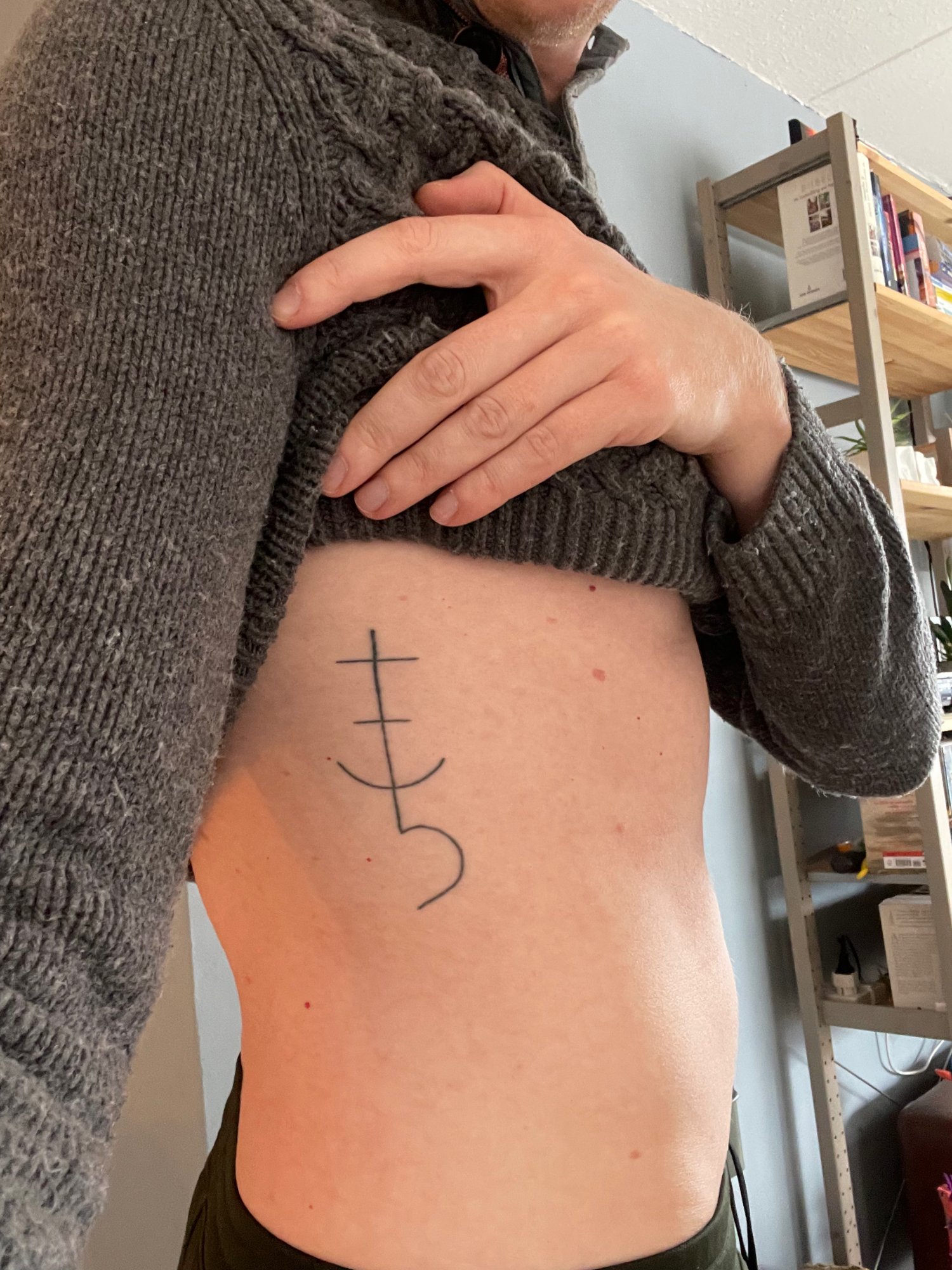 A few years ago I designed my own. I wanted "faith, hope, love", but not in the way everybody already does. So i started drawing. I wanted something clean, minimalistic, and thus I started with a horizontal line. That line was crossed by another line, making the first part (faith). Another line crossing the horizontal one with an added arch made the second part: the anchor representing hope. And finally, one other bowed and dented line would end the horizontal line by making the right half of a heart, representing love.