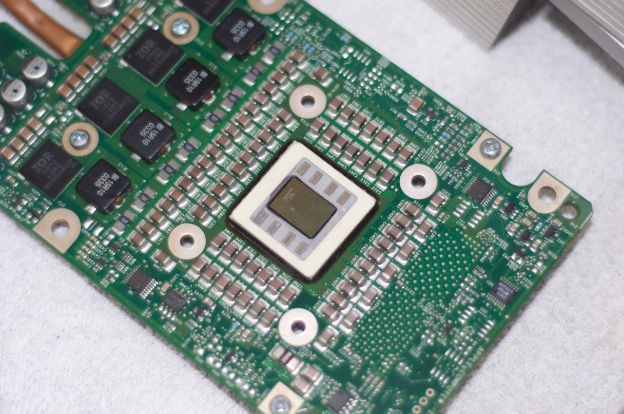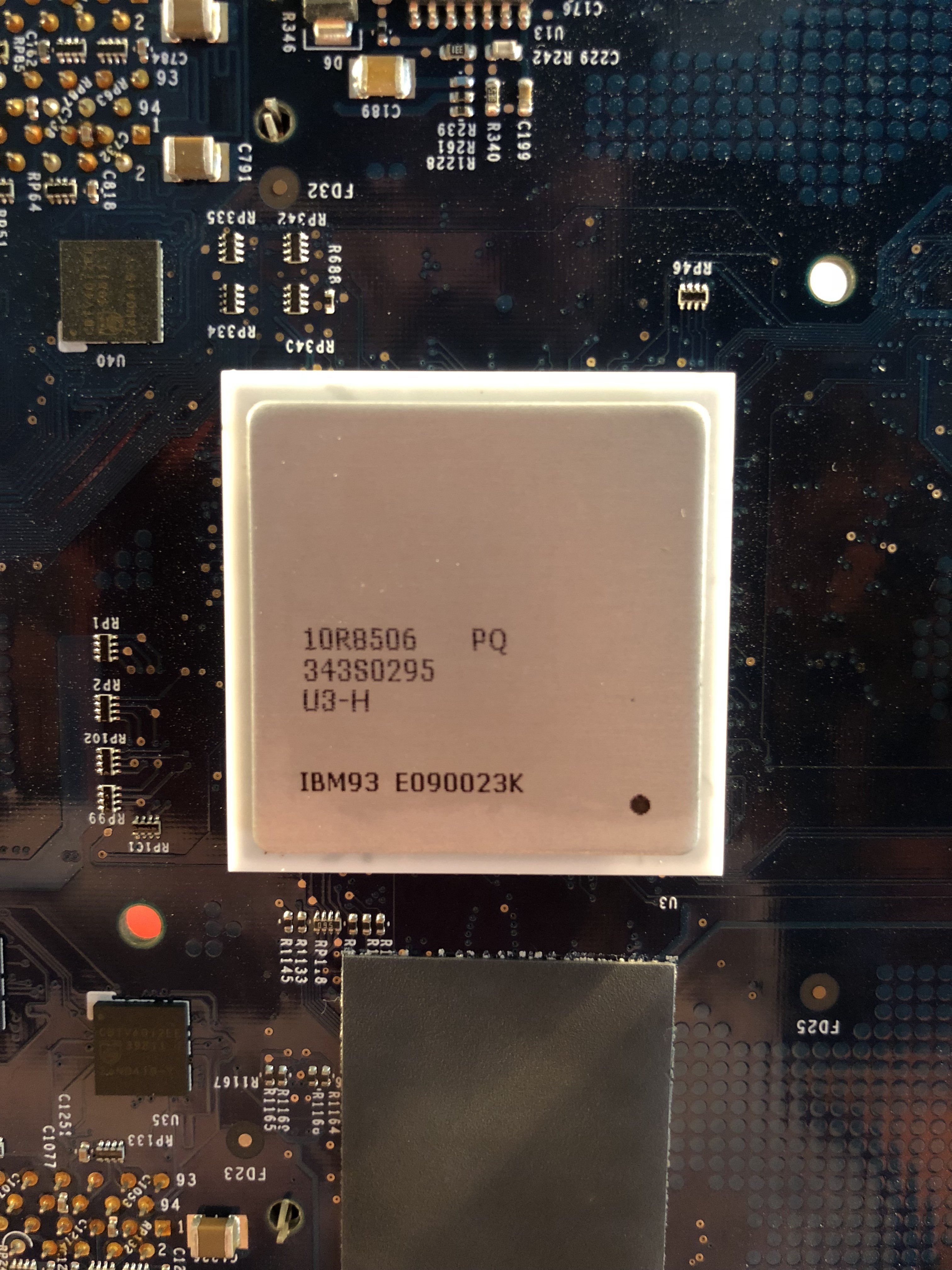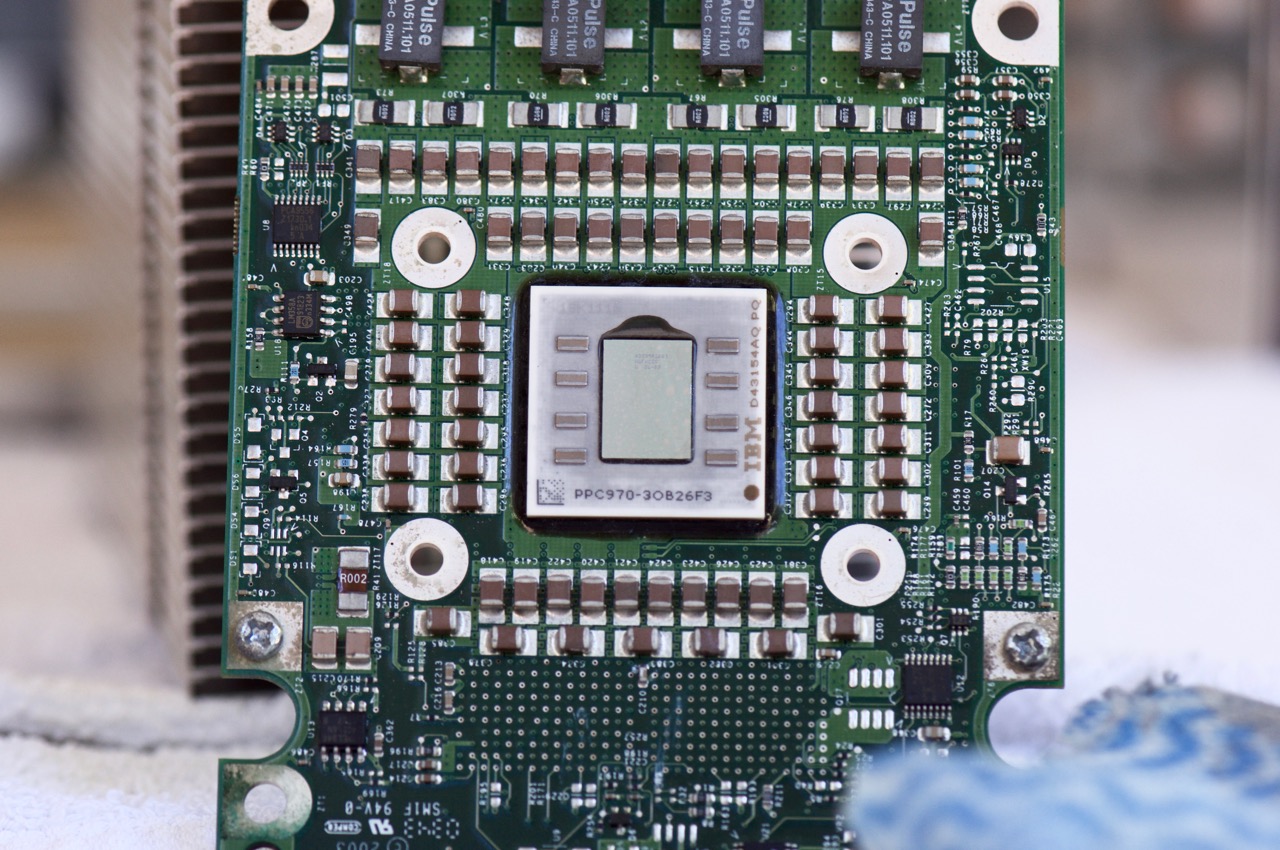 9. A beauty shot of the first 970 CPU after a cleanup. Notice the massive array of components around the CPU, this is matched on the other side of the PCB. I wonder if these make up the G5's "215 simultaneous in-flight instructions per CPU". A rough first count was 196, maybe I missed some.