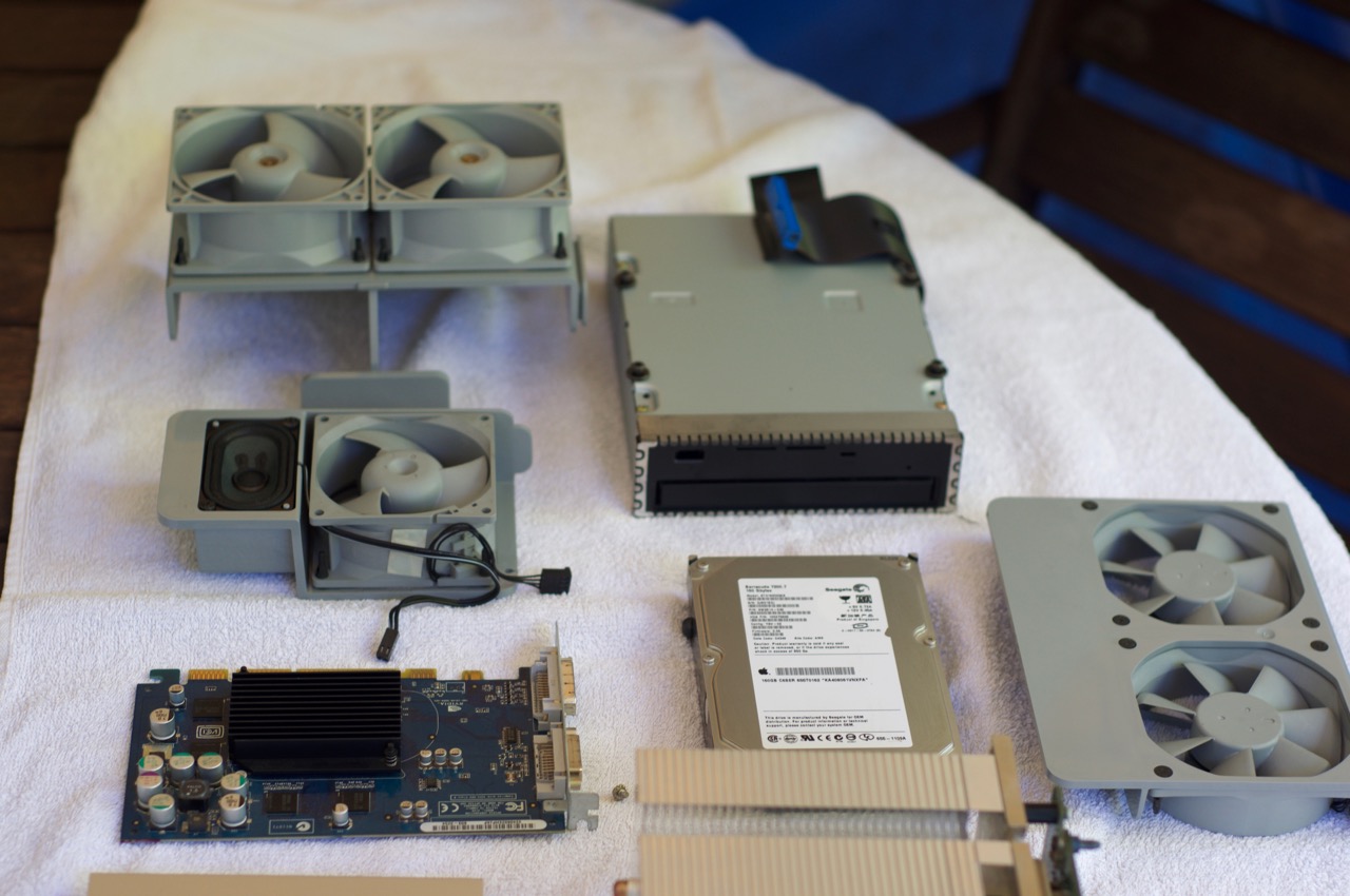 2. The first G5 (Dual 1.8Ghz) is stripped and the PSU is removed, all the components are lined up for cleaning with an old toothbrush.