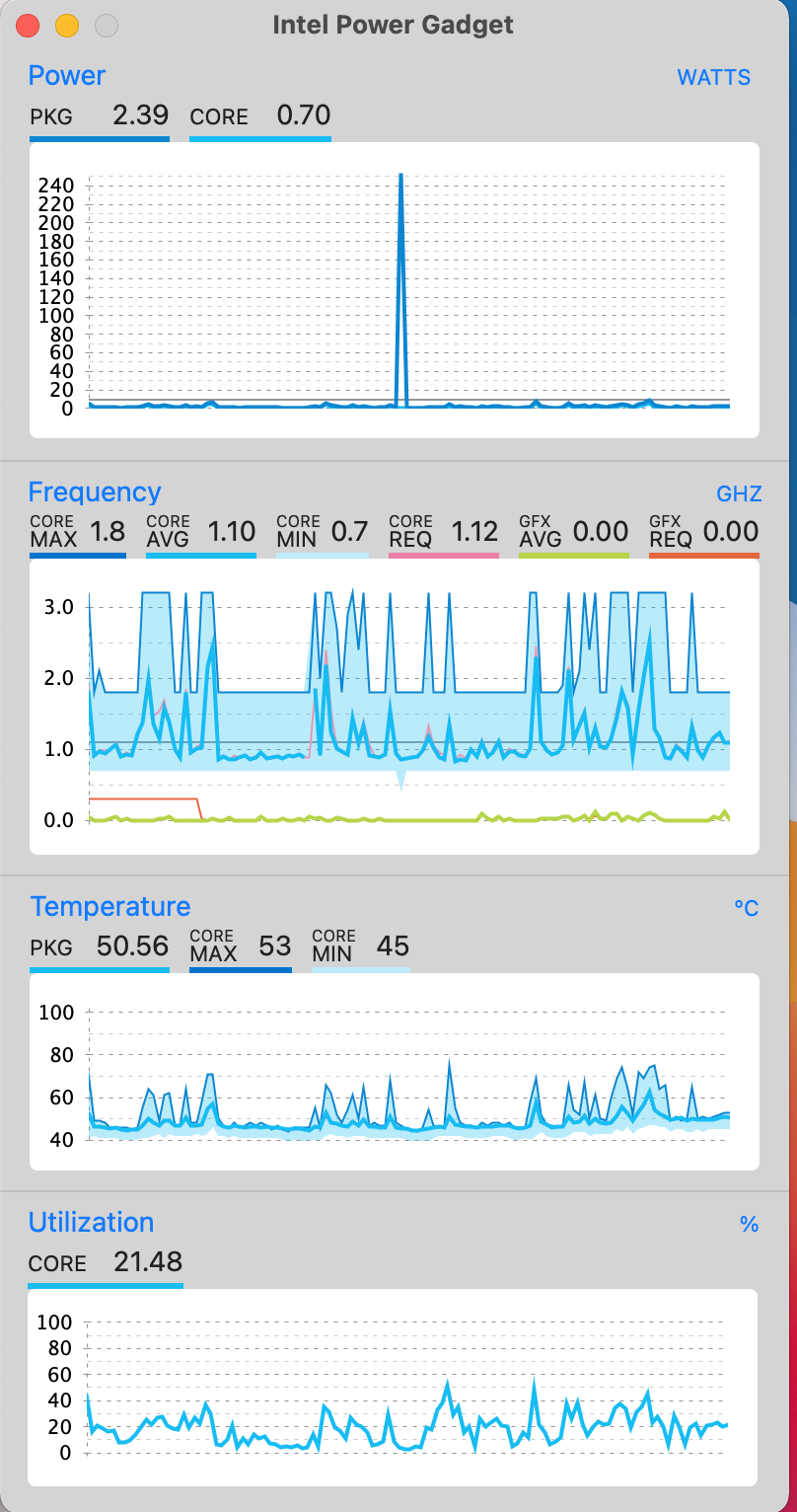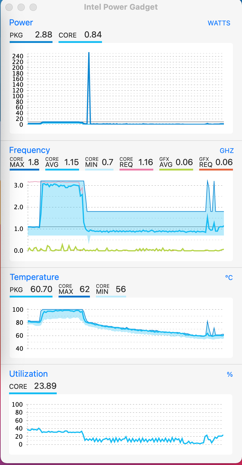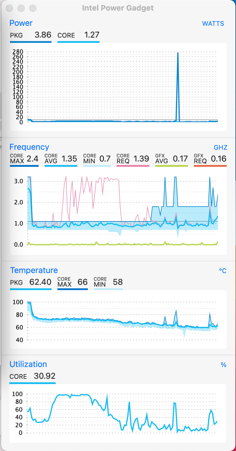 I just got a refurbished dual core 13 MacBook Air (2020 Model). I wanted to test how it cools using some software that I know makes laptops run hot (in this case, MailSteward). I set up Intel Power Gadget 3.7.0 to track the processor and Turbo Boost Switcher Pro to protect the processor. They're both setup right. I have the same rig in my i5 MacBook 12" (2017 Model) so I'm familiar with behaviour I anticipated.