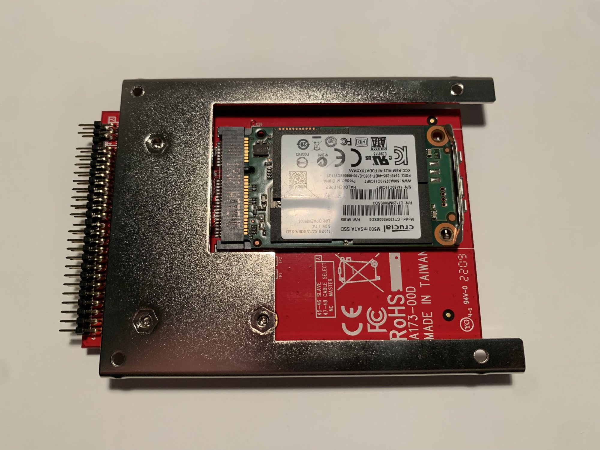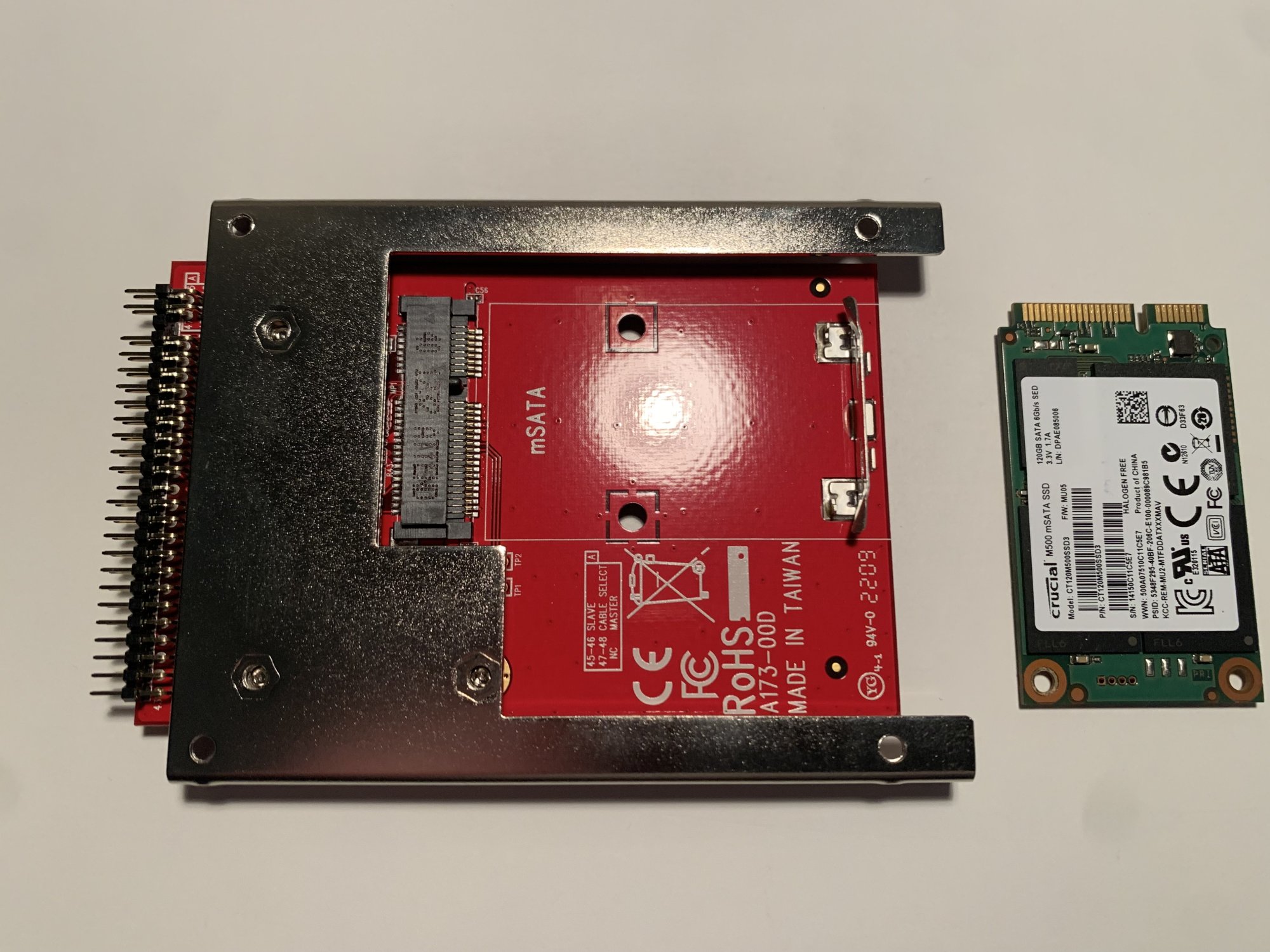 Next, I tried an Ablecon IIDE-MSAT adapter, which uses the Marvell 88SA8052 chipset and the same Lite-On SSD. With this adapter installed, the CDROM module was completely unrecognized by the PowerBook. It is like that ATA interface didn't even exist in System Profiler. The PowerBook ran just fine with or without the CDROM module installed, though the CDROM was completely unrecognized. I briefly tried an Intel mSATA SSD with the Ablecon adapter, but it showed the same symptoms of a completely unrecognized CDROM module.