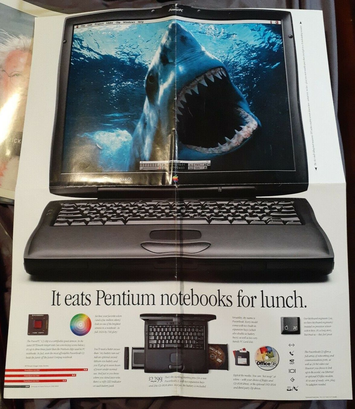 I loved these ads! I have some Time and Newsweek magazines with these type of Apple ads. But with paper magazines being a dying industry, its hard to translate to the web, but they pretty much do it these days on their website in a dynamic way. I would like them to go back to more white or lighter background to put more emphasis on the product as you can clearly see in this add.It's quite appropriate to bring up the Powerbook G3 along with the M1... back in the day Apple boasted the G3's performance over the Pentium's, I remember this fun ad that they had back in the day "It eats Pentium notebooks for lunch". M1 is bringing back the good times 😏