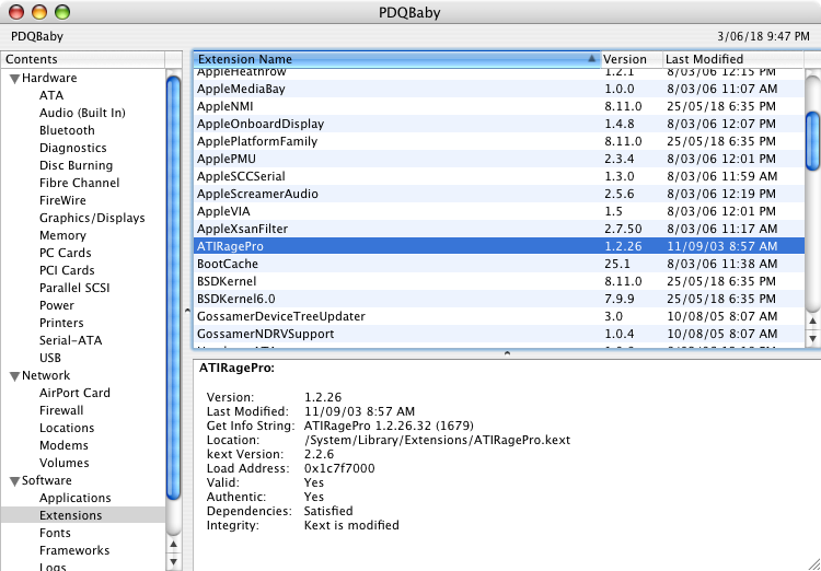Code:sudo chown -R root:wheel /System/Library/Extensions/ATIRagePro* sudo chmod -R 755 /System/Library/Extensions/ATIRagePro* sudo touch /System/Library/Extensions sudo rm /System/Library/Extensions.mkext sudo rm /System/Library/Extensions.kextcache