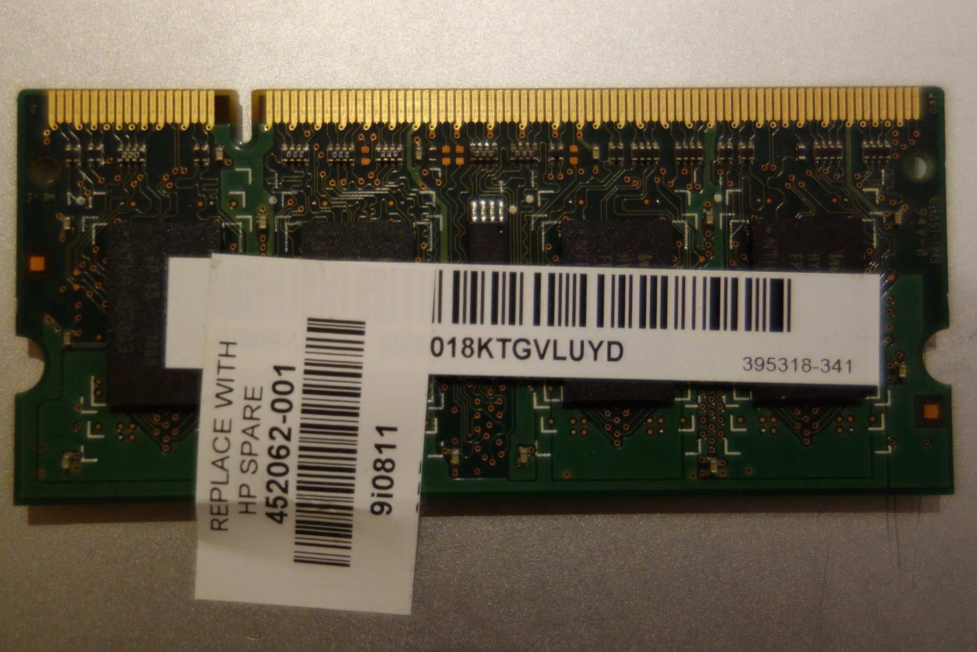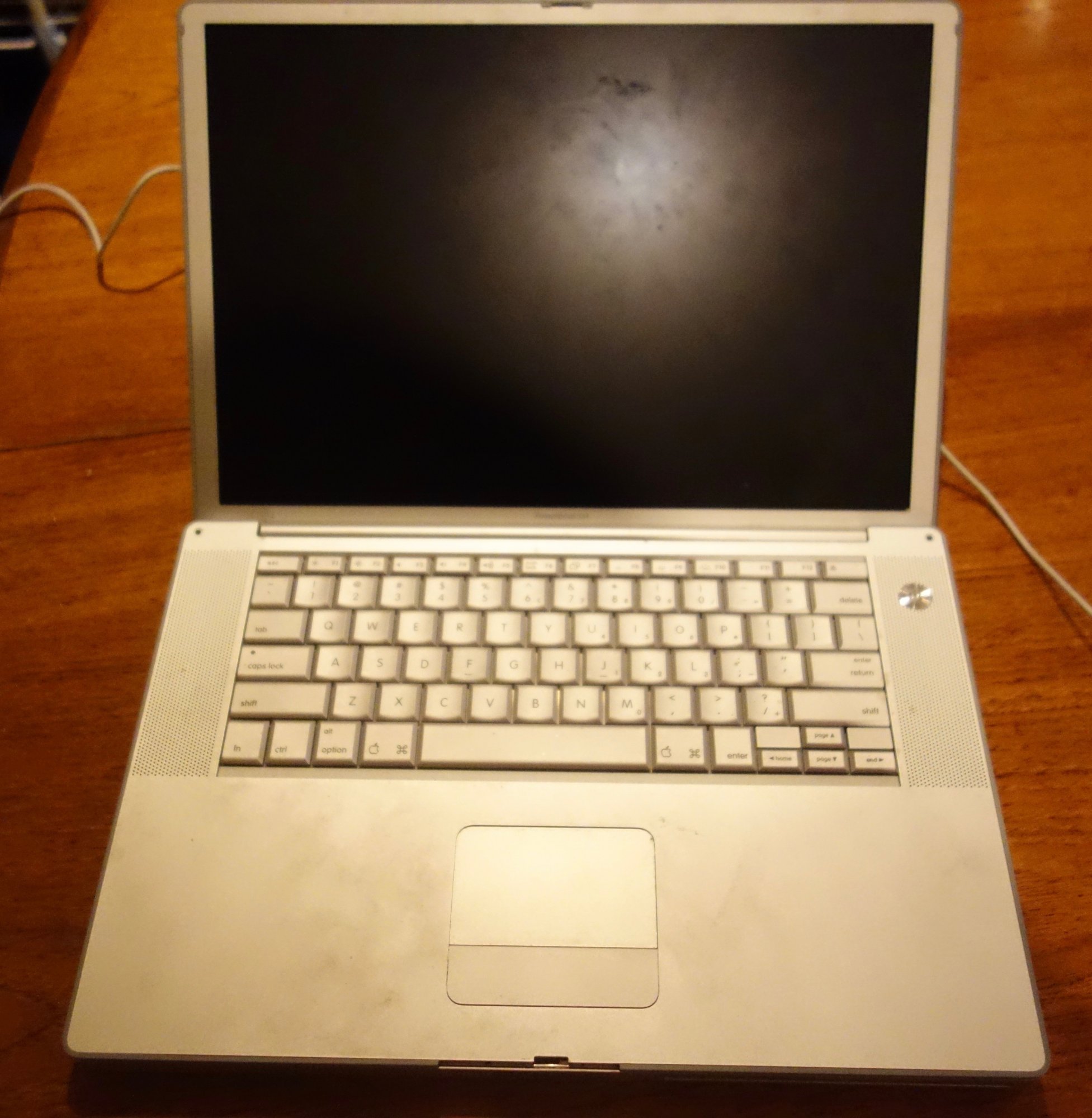 Next stage complete - it now has 2x 1 GB PC2-4200 SODIMMs from the junk pile. It gets to a clicking hard disk, with the screen showing signs of life.