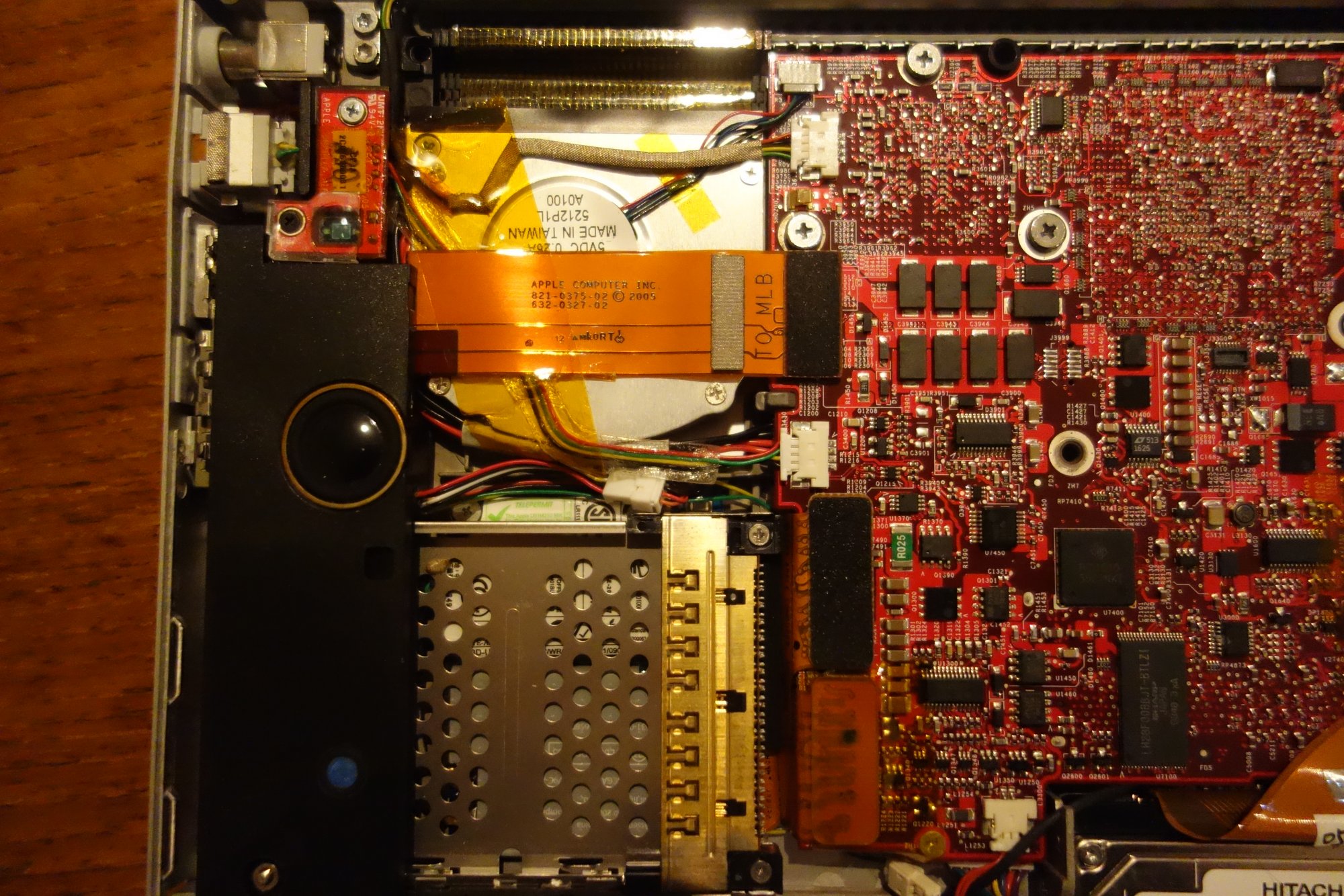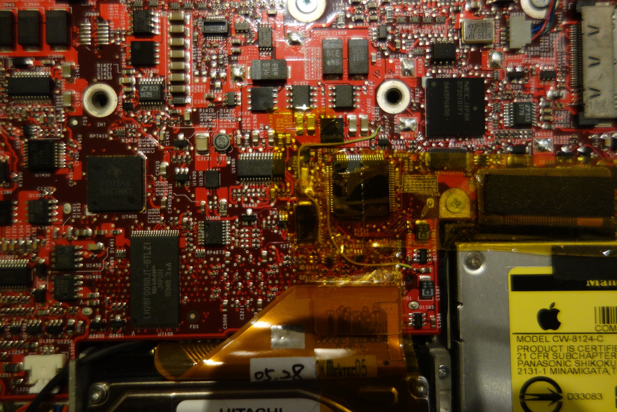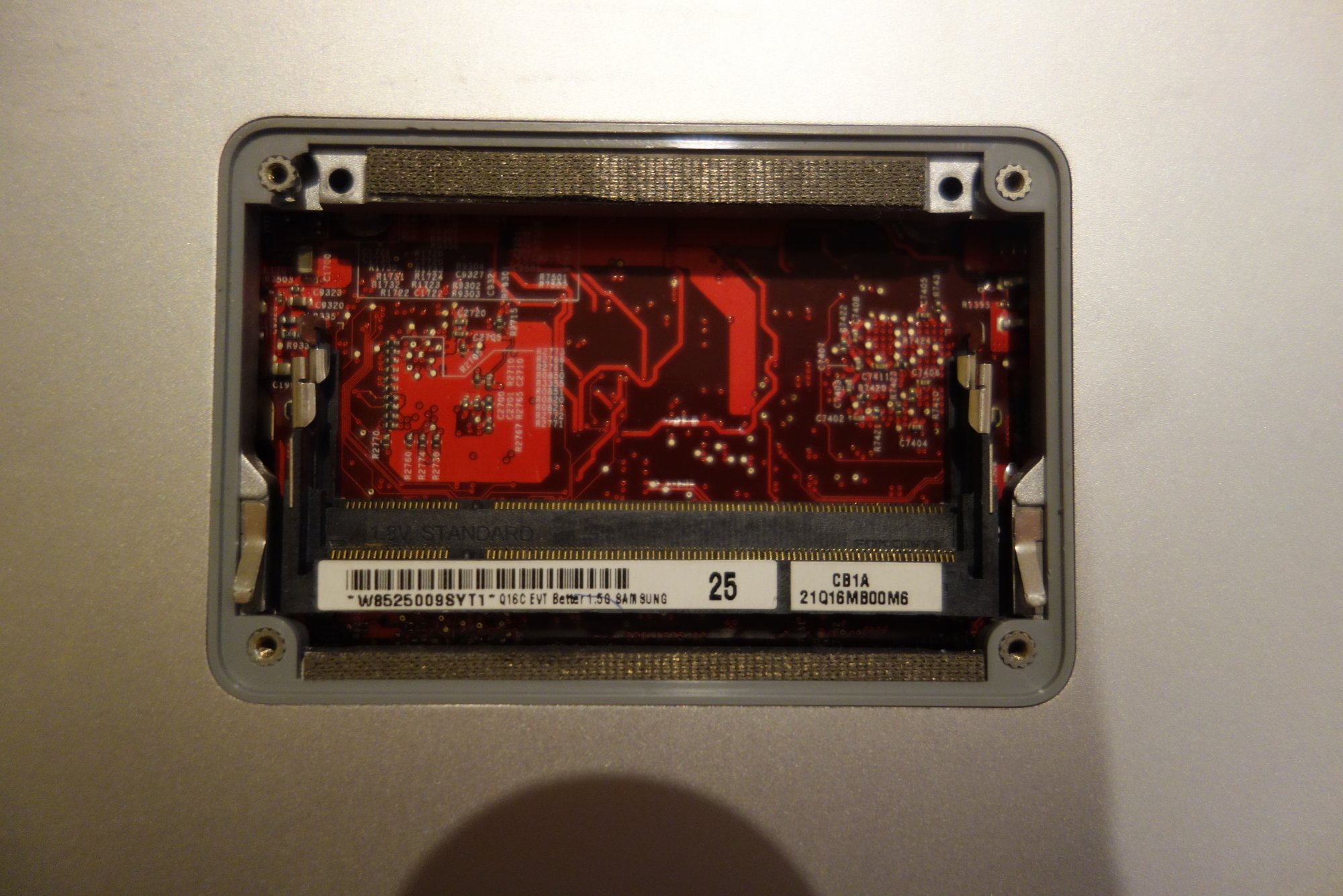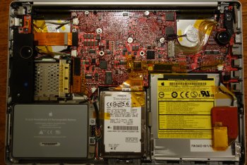 I'm at work and I don't have the auction link handy, but it has a photo of the other side of the board through the missing RAM door - IIRC it's marked as a "Q16C EVT Better 1.5" with DDR2 SODIMMs (and the layout looks like the 1.67 GHz DDR2 going by iFixit)It’s certainly not every day one sees red PowerBook innards!