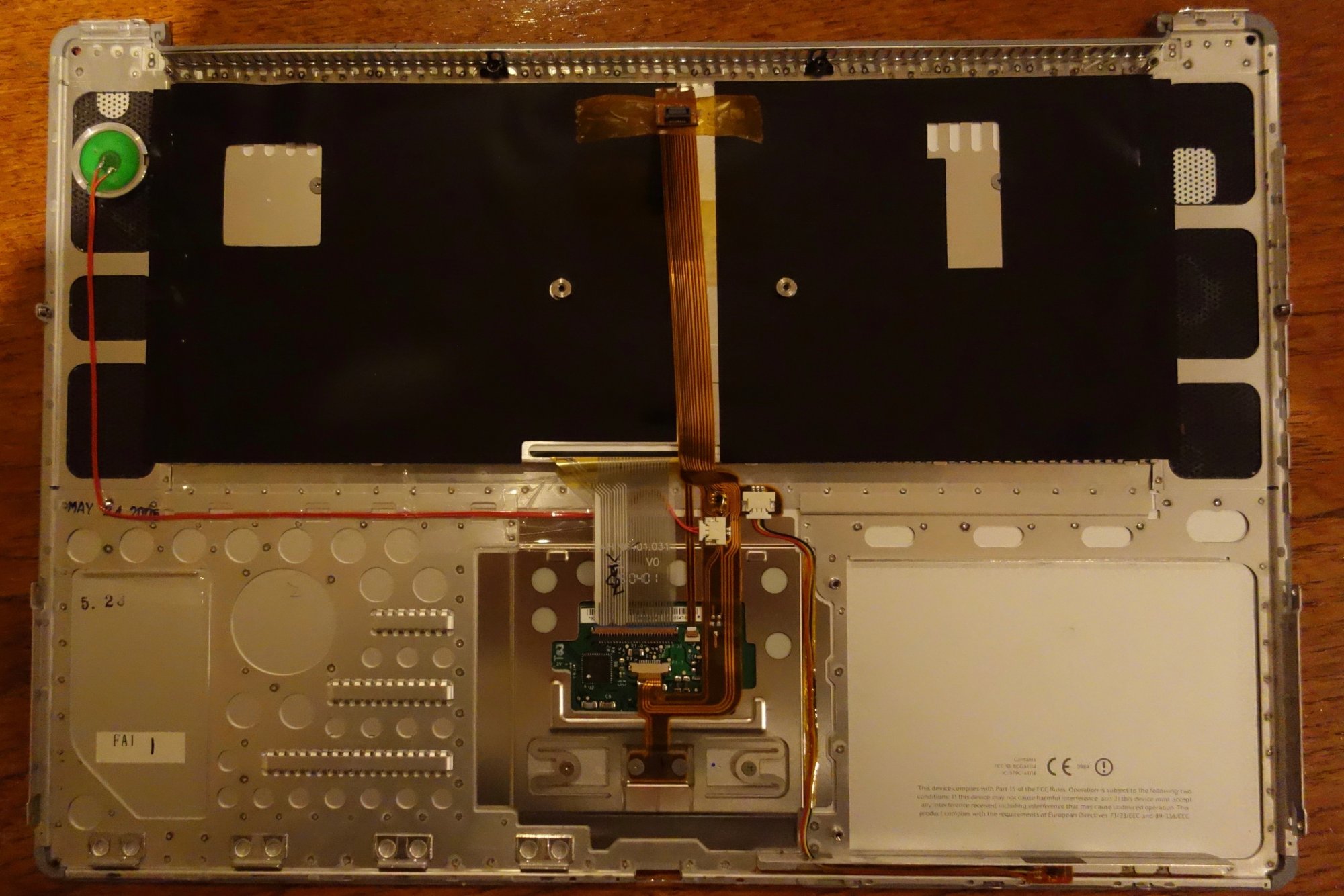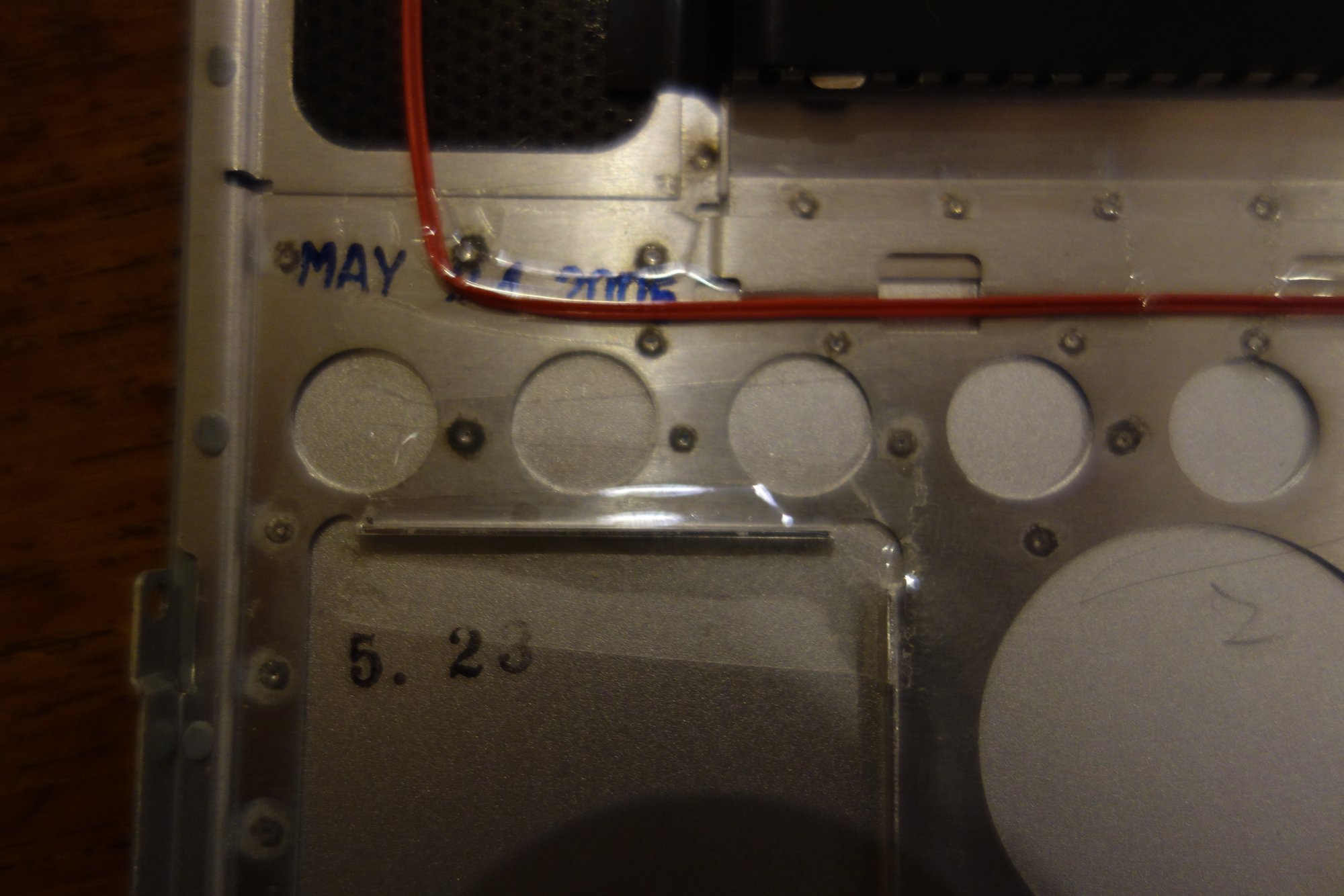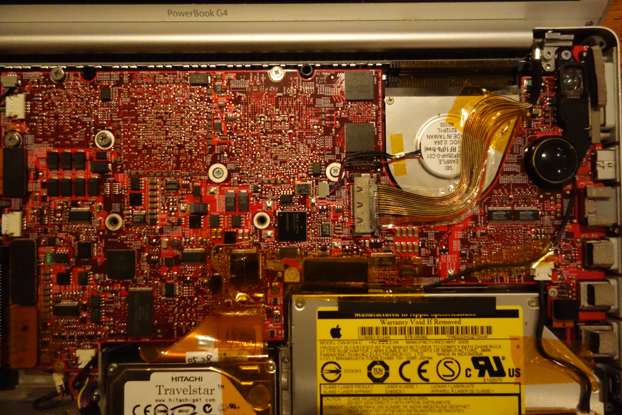 I'm at work and I don't have the auction link handy, but it has a photo of the other side of the board through the missing RAM door - IIRC it's marked as a "Q16C EVT Better 1.5" with DDR2 SODIMMs (and the layout looks like the 1.67 GHz DDR2 going by iFixit)It’s certainly not every day one sees red PowerBook innards!