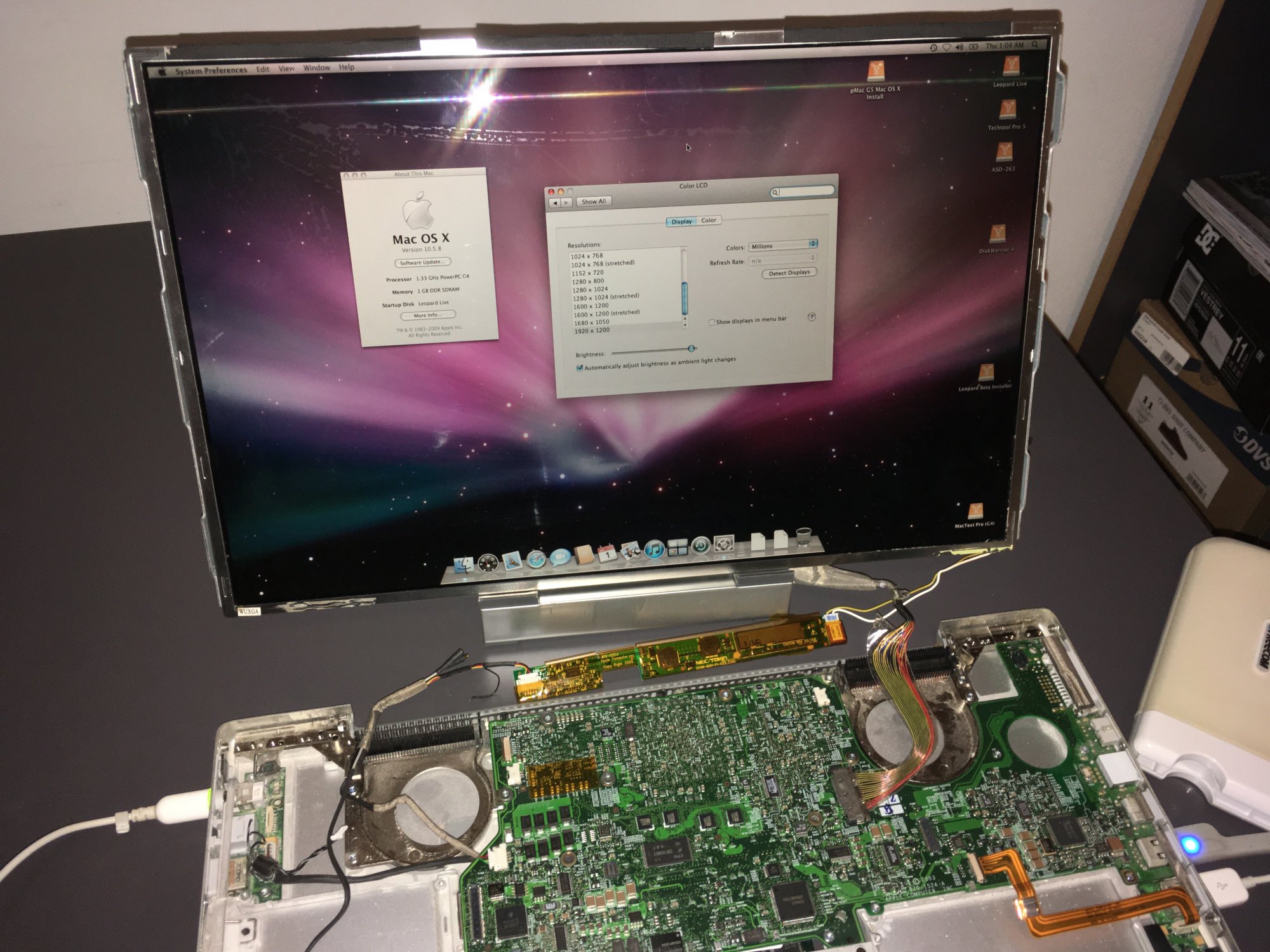 I'm really amazed that such a high-res display works in a notebook that old. It is almost unrealistic to see OS X Leopard in such high resolution on a laptop. I wasn't aware that this isn't as easy going with early MacBook Pros but I don't own any because of all the GPU issues – they are kind of doomed unfortunately. What I've learnt so far from my testing with PowerBooks is that pretty much any LCD will work with 17" PowerBook G4s as long as it is the right size, CCFL and 30pin. Kind of ridiculous but do you know what else a 17" PowerBook G4 (donor) is good for?