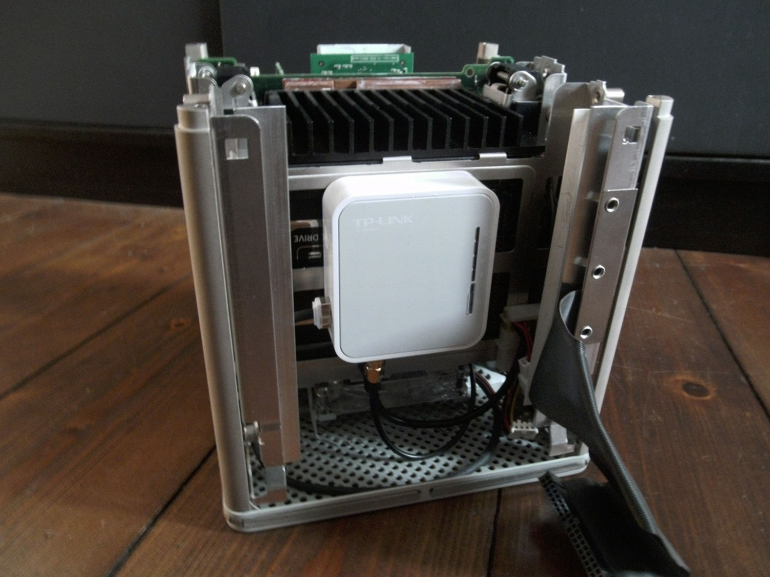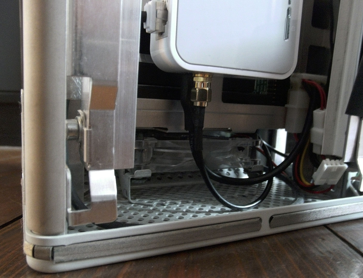 In front is the antenna. Behind the power, which is Mini-USB on the routers side and connected to 5 volts of Cube's Molex. And on the left the network cable, which is the only part, beeing visible from the outside.