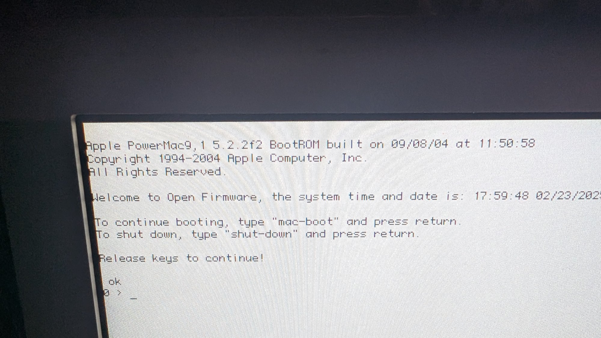 Power Mac powers up and boots to the folder icon with question mark as expected as there is no OS installed and I am able to access the OFW. There is to my surprise a Mac OS install disk in the drive bay, this is Mac OS v 10.1.4.
