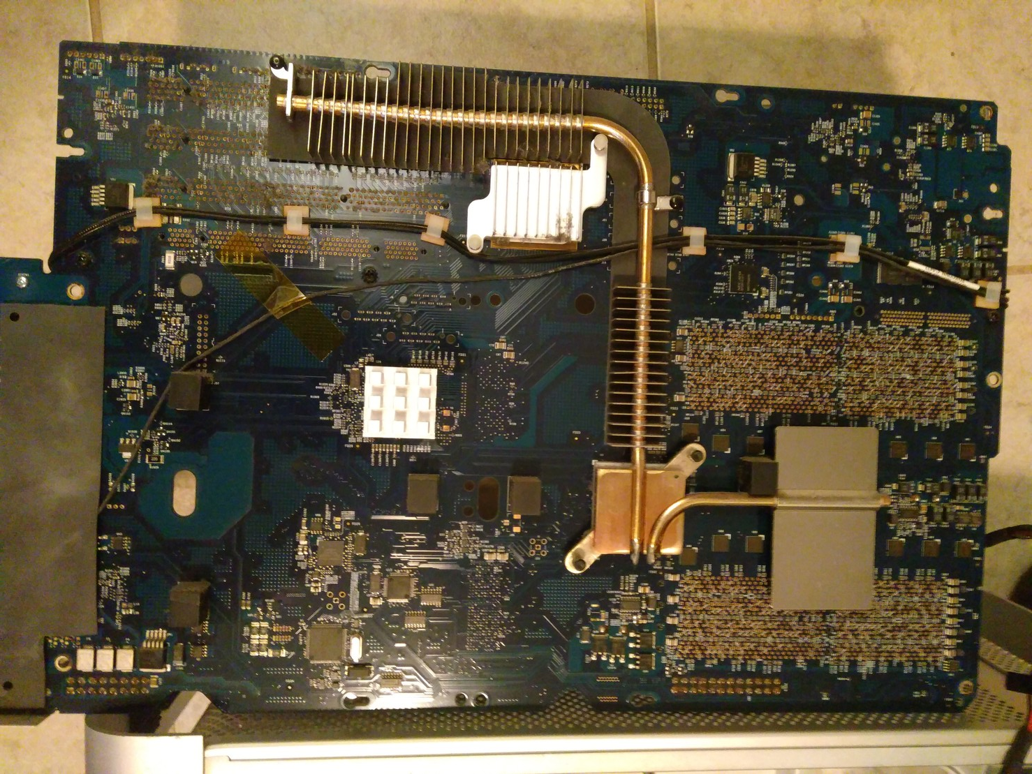 After reassembling, the G5 would not start. At all. I took out the CMOS/BIOS battery (still the original), then re-seated it and reset the PMU down near the lower front of the logic board, near the lower bay of RAM slots. Still nothing.