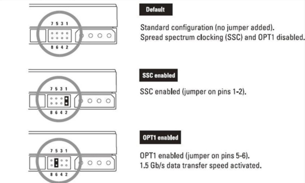 HOWEVER, the SATA III -> SATA I functionality is still there, but it is now implemented via a nearly completely undocumented jumper on the drive. There are in fact four jumpers on the drive, all of which are largely undocumented. They do not show up at all in any of the documentation supplied with the drive, nor in anything you can find easily on the web. However, if the right jumper is installed, it shifts the drive from SATA III to SATA I. I discovered this after getting the idea from trolling through the web courtesy of "Mr. Google", followed by an online chat with WD technical support. After following a fairly obscure series of links, I finally came upon some detailed information on the drives and voila! there was the jumper documentation!