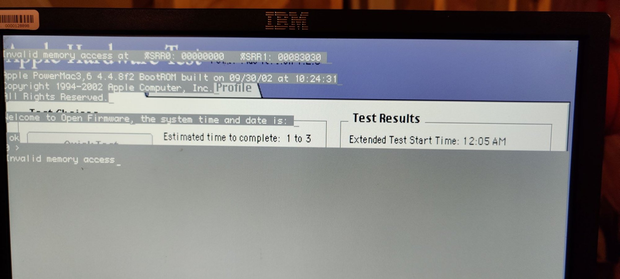 I tried OS9.2.2 (For the Powermac G4 model) only to get a illegal instruction error within seconds of the boot screen (image attached). I also tried apple hardware test, which got about partway through the logic board test before throwing an invalid memory access. When I tried removing and changing the memory modules, I got the same errors (once getting an error I could find anywhere else, saying that "someone has tried to write to location ZERO!!" - with exactly that case and punctuation). I gave up on trying OS9 and moved to OSX, but I kept getting the error that must restart my computer.