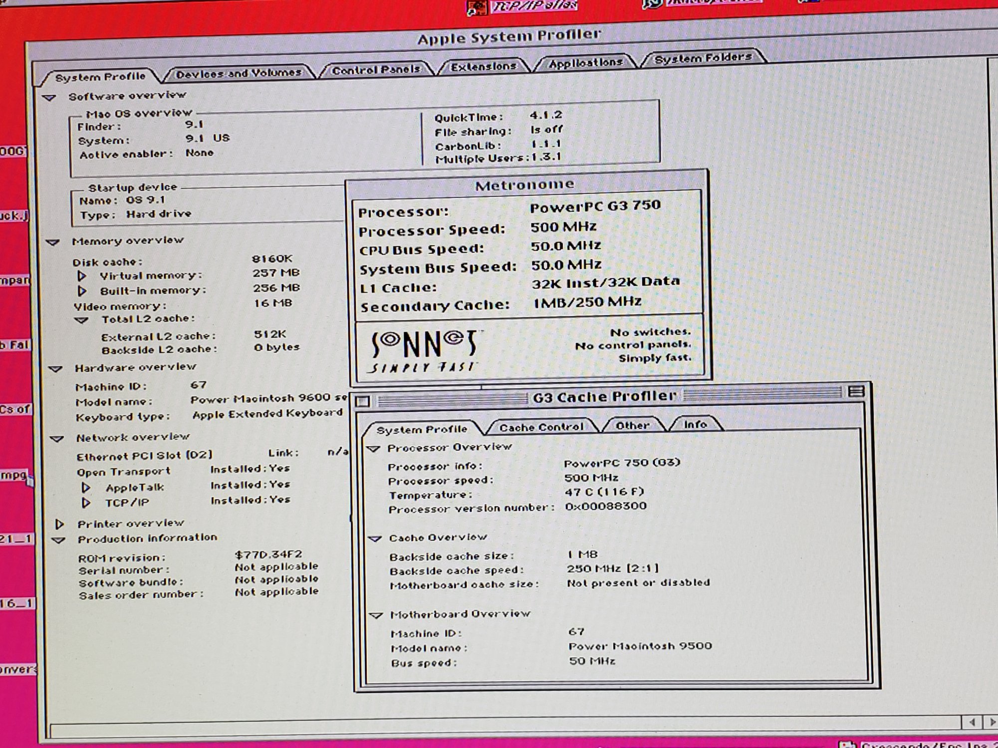 LBF asked me how I verified L2 was working...here's an interesting picture showing the system profiler, Sonnet metronome and Powerlogix profiler. System profile doesn't show my 1MB cache though.View attachment 1728695